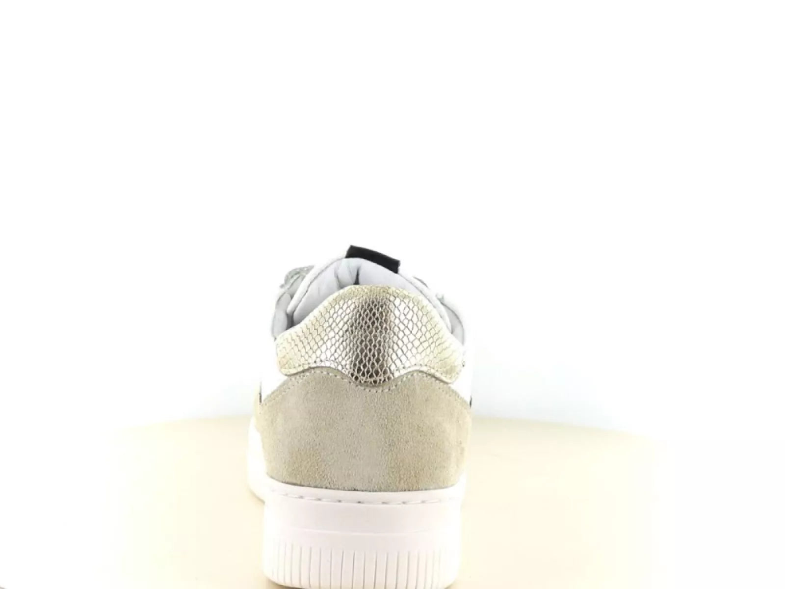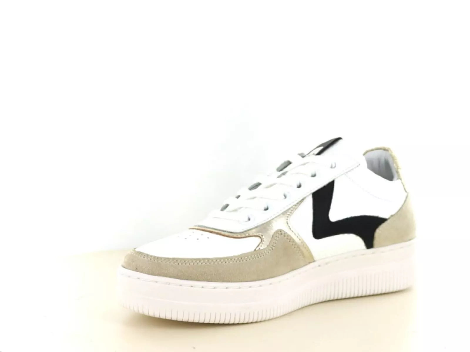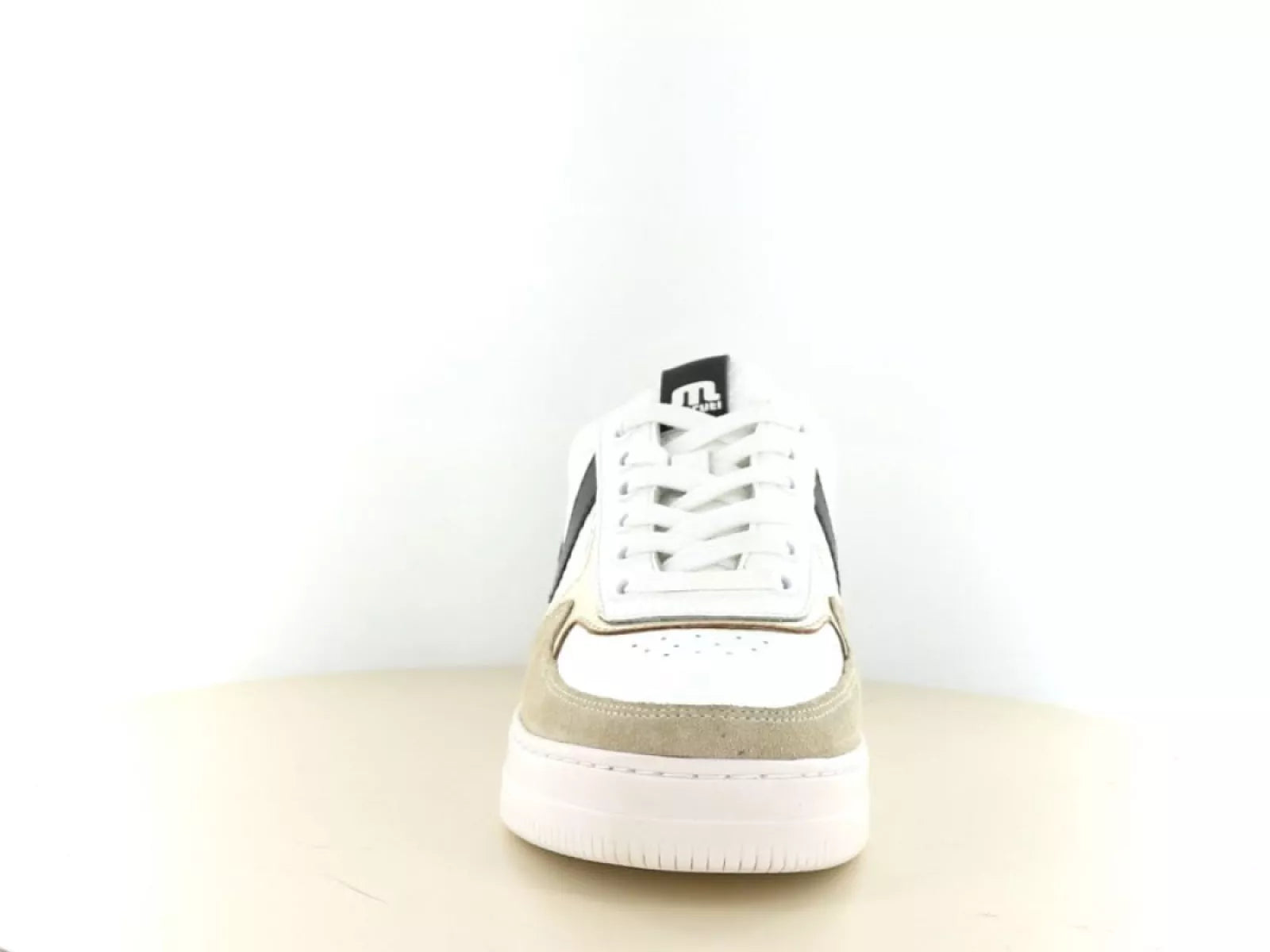 Die elegante Farbkombination aus Weiß, Beige und Schwarz macht diesen Sneaker vielseitig und lässt sich sowohl mit lässigen als auch formelleren Outfits kombinieren. Der Schnürverschluss bietet einen verstellbaren und sicheren Sitz, während das herausnehmbare Fußbett die Möglichkeit bietet, eigene Einlegesohlen zu verwenden, was für zusätzlichen Komfort und Halt sorgt.