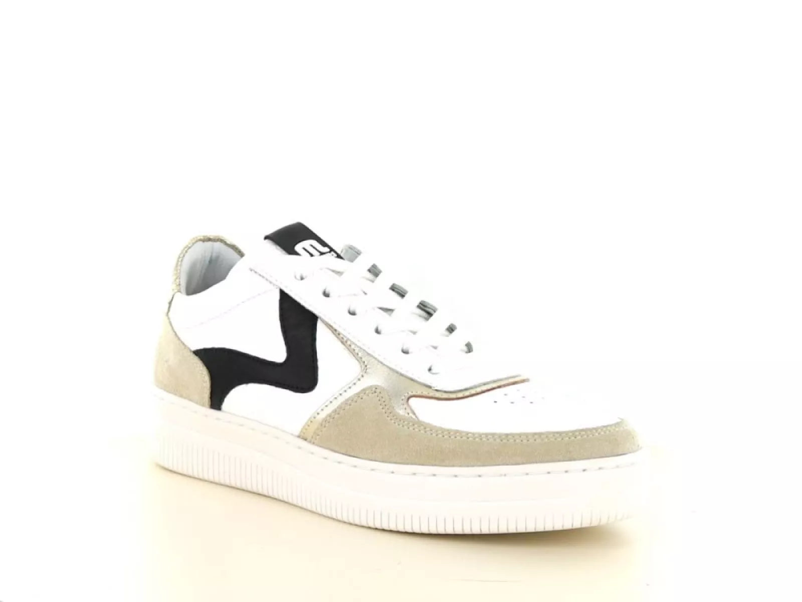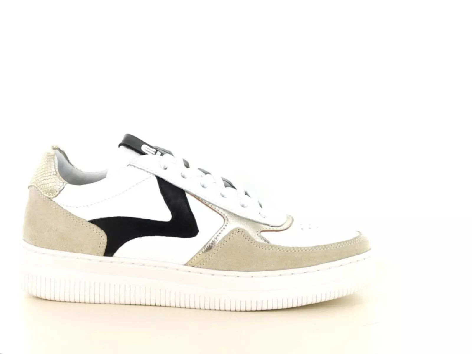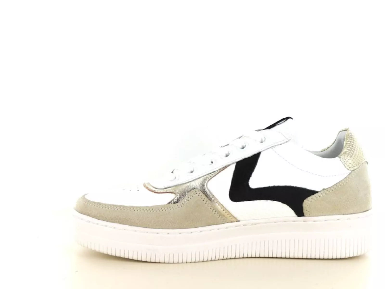 Die elegante Farbkombination aus Weiß, Beige und Schwarz macht diesen Sneaker vielseitig und lässt sich sowohl mit lässigen als auch formelleren Outfits kombinieren. Der Schnürverschluss bietet einen verstellbaren und sicheren Sitz, während das herausnehmbare Fußbett die Möglichkeit bietet, eigene Einlegesohlen zu verwenden, was für zusätzlichen Komfort und Halt sorgt.