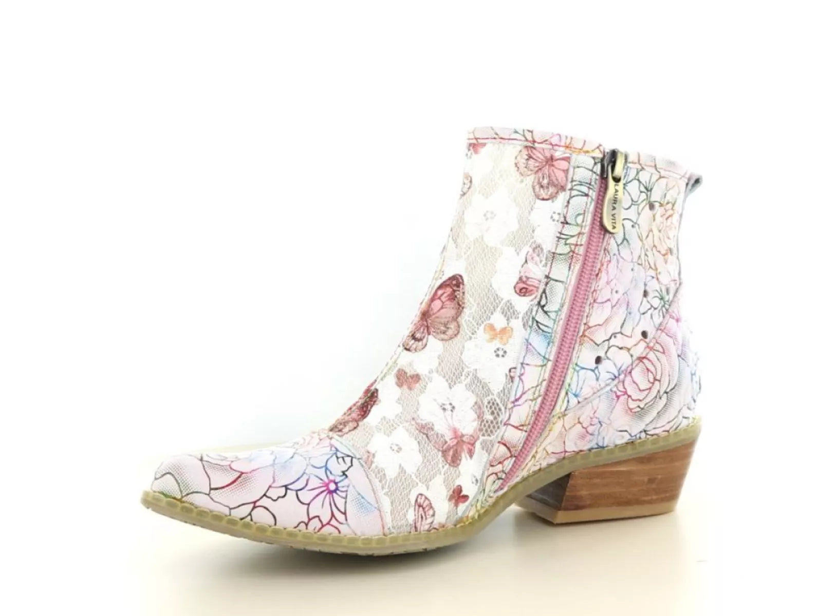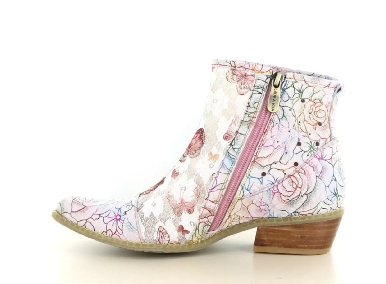 Der Hicnio 23 von Laura Vita ist ein eleganter Damenstiefelette mit einem unverwechselbar femininen Look. Diese zart puderfarbene Variante kombiniert romantische Blumen- und Schmetterlingsmuster mit dezenten Farbtupfern und spiegelt so perfekt Laura Vitas unverkennbaren künstlerischen Stil wider.