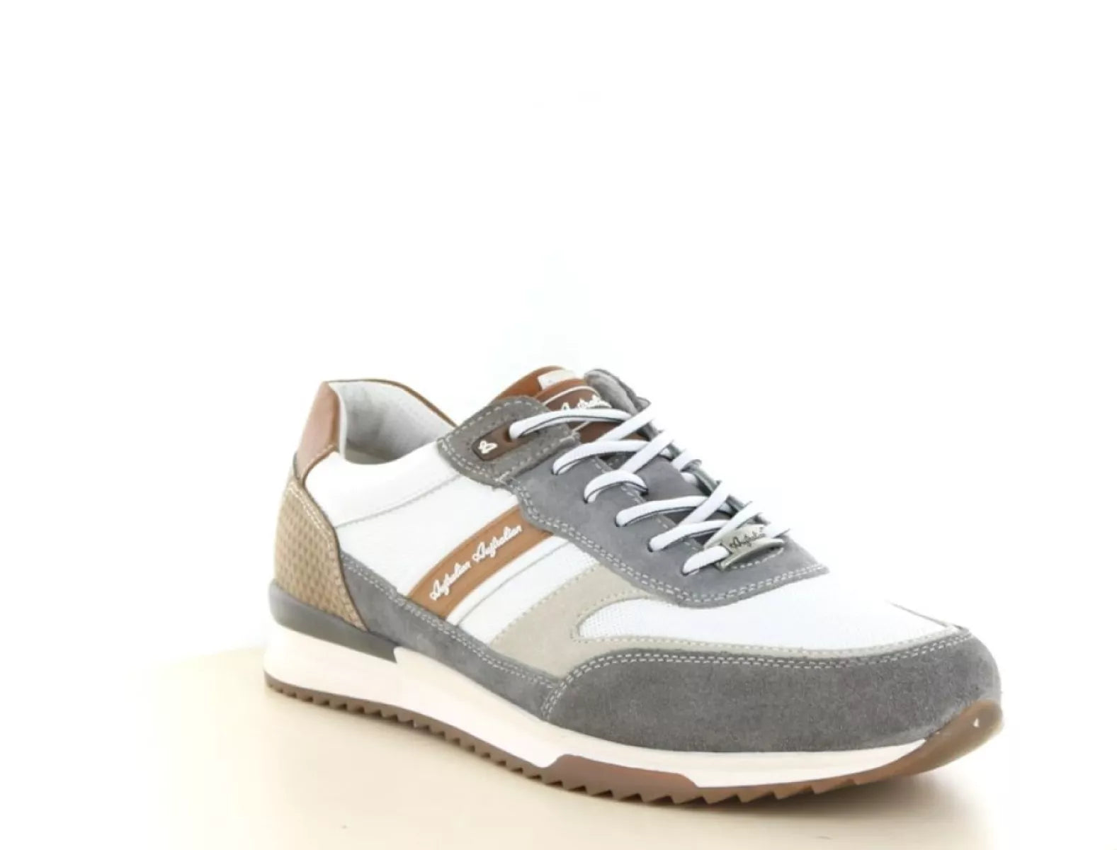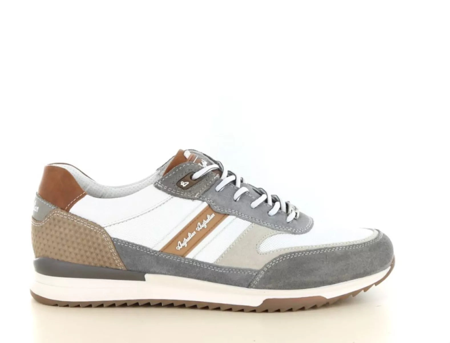 Der Australian Filmon ist ein stylischer und sportlicher Herren-Schnürschuh, der perfekt zu einem modernen, lässigen Look passt. Dieses Modell ist aus hochwertigem Leder gefertigt und mit Wildlederakzenten versehen, die ihm einen luxuriösen Look und zusätzlichen Charakter verleihen. Die frische Farbkombination aus Weiß, Grau und dezentem Blau, ergänzt durch cognacfarbene Details, verleiht diesem Herren-Sneaker einen zeitgemäßen und vielseitigen Look.