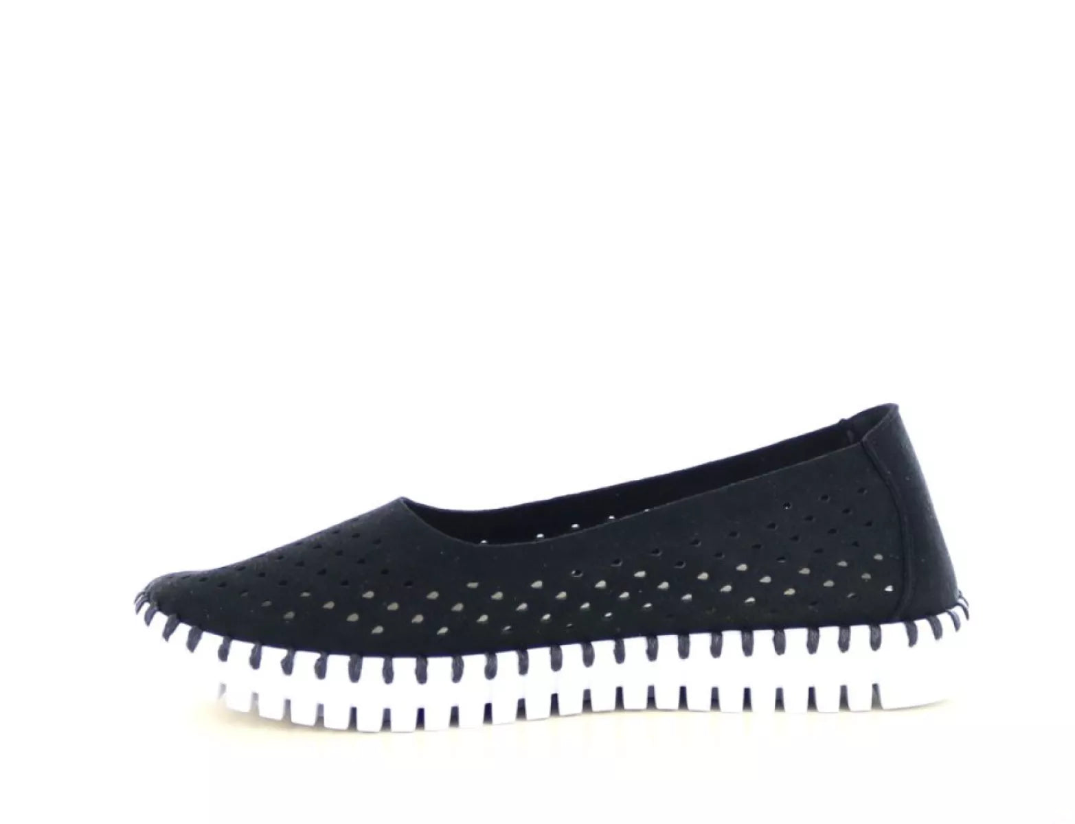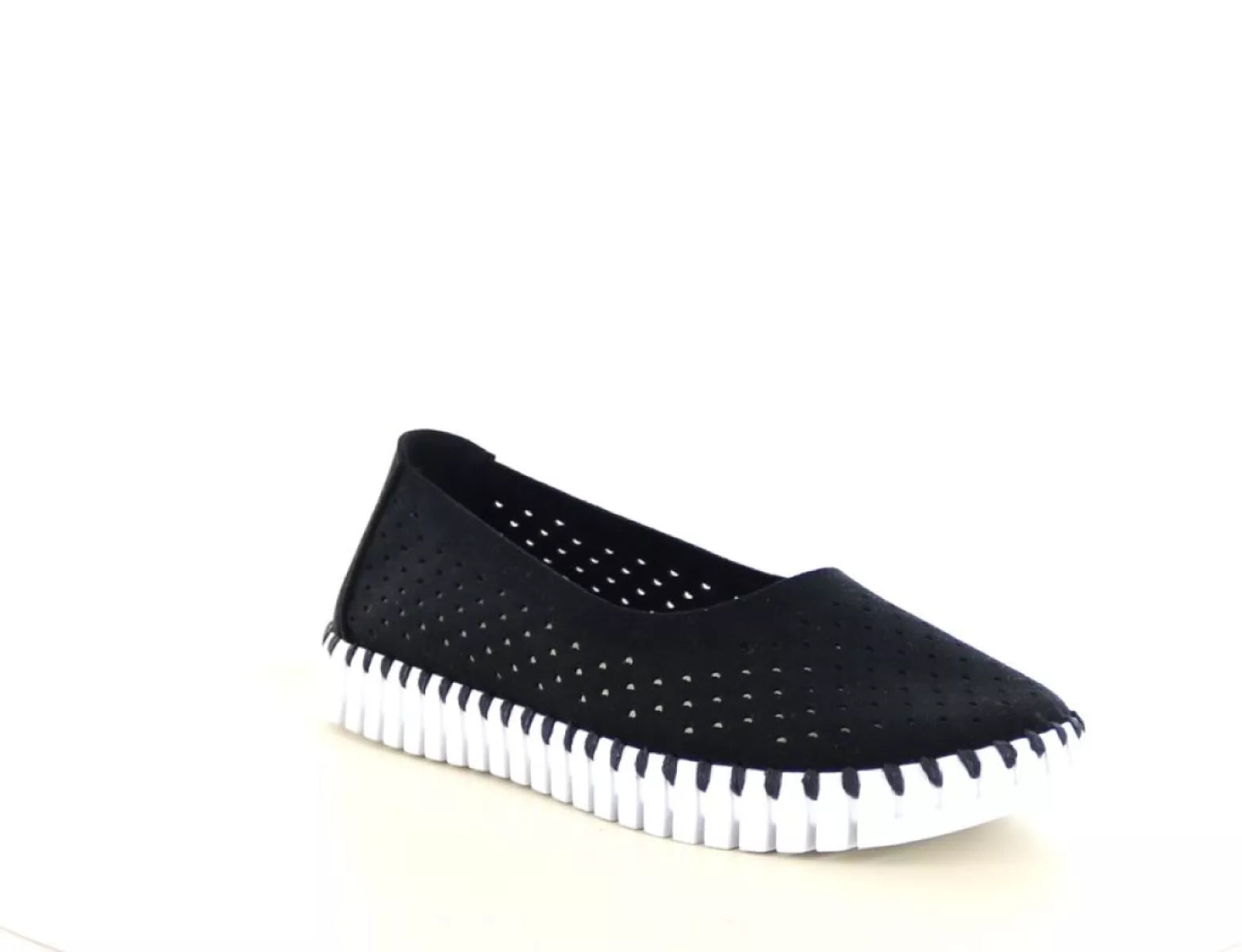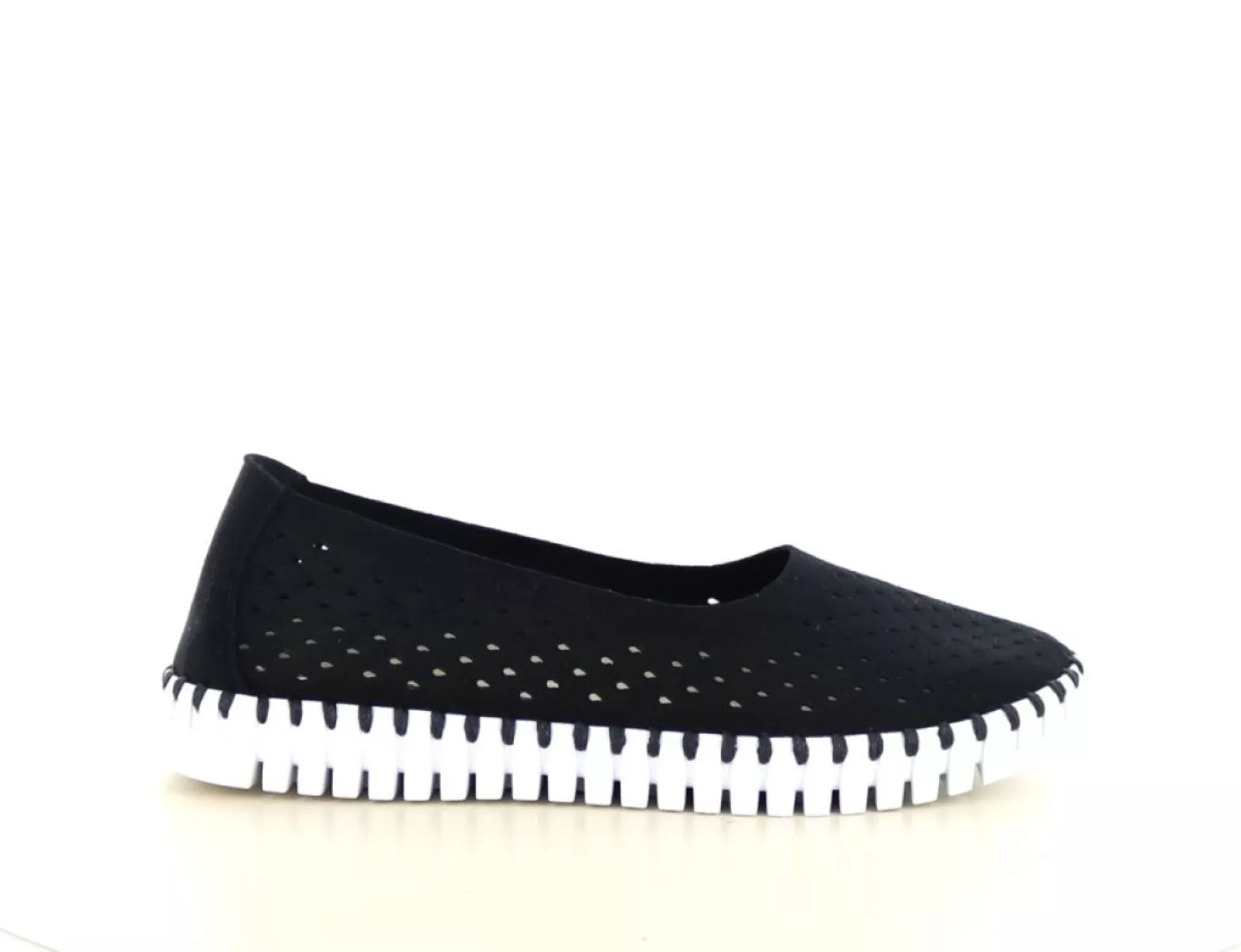 Zeitlos, leicht und bequem – das ist der Ilse Jacobsen Tulip 3579 Ballerina in klassischem Schwarz. Dieser stylische Damen-Slipper ist aus geschmeidigem, dehnbarem Material gefertigt und verfügt über ein dezentes Lochmuster für optimale Belüftung an warmen Tagen. Das minimalistische Finish in Kombination mit der markanten weißen Sohle verleiht diesem Ballerina einen frischen, modernen Look, der jede Sommergarderobe ergänzt.