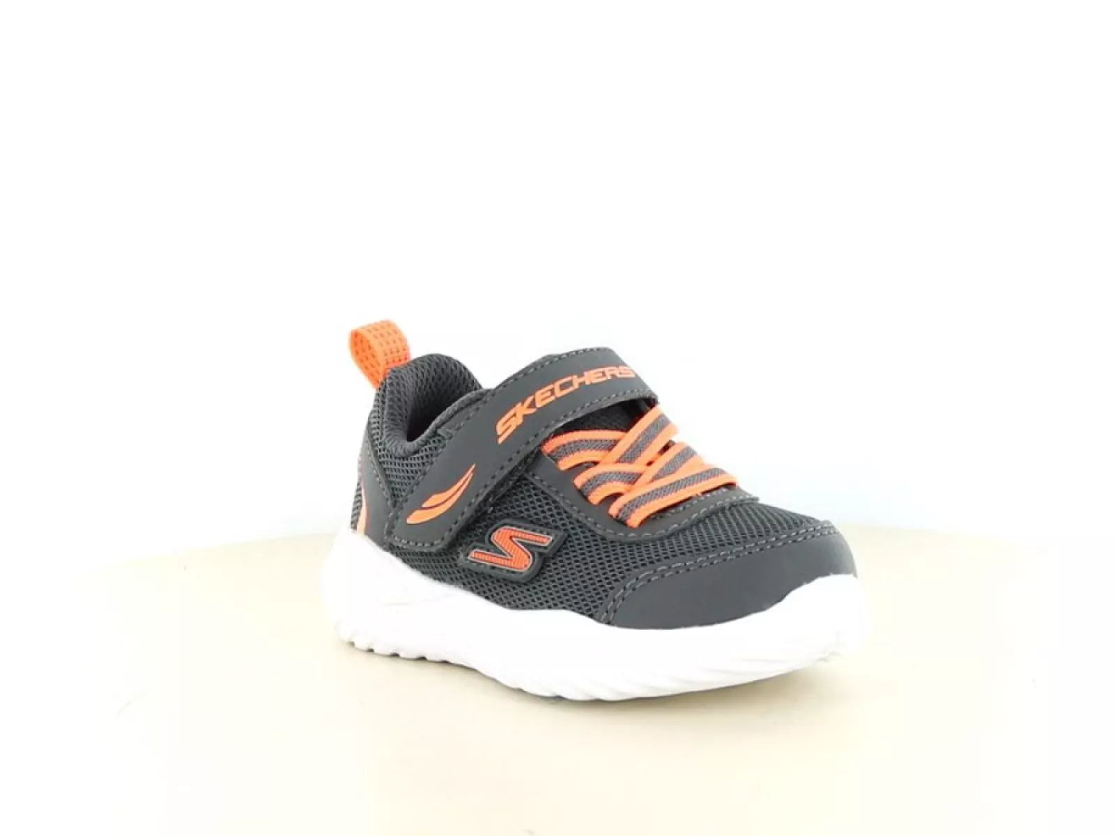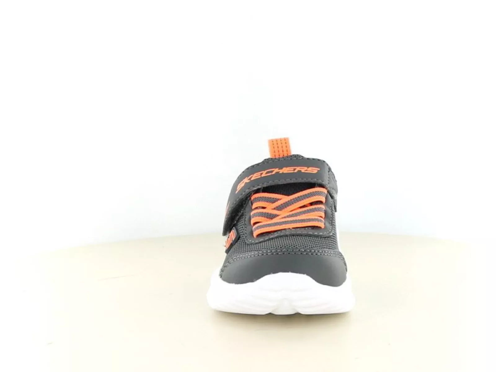 Der Skechers 407308N Klettschuh ist speziell für Jungen konzipiert, die Wert auf Komfort und Stil legen. Der Schuh besteht aus hochwertigem Kunststoff, der für Langlebigkeit und einfache Pflege sorgt. Die graue Farbe mit orangefarbenen Akzenten verleiht dem Schuh einen sportlichen und trendigen Look.