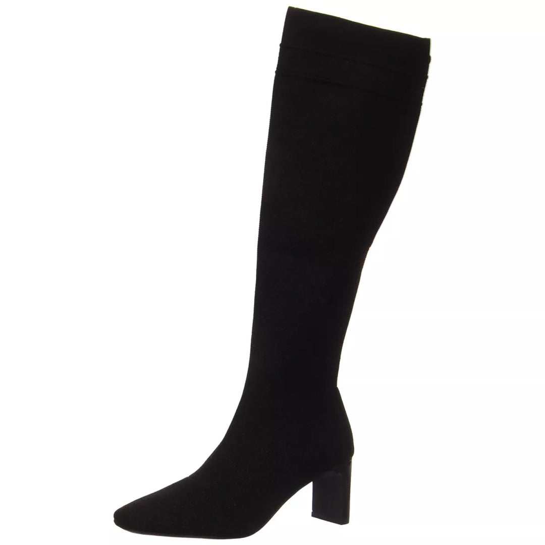 Der robuste Blockabsatz von ca. 5–7 cm sorgt für zusätzliche Höhe, ohne an Stabilität einzubüßen. Der dezente Glitzerakzent im schwarzen Stoff verleiht einen Hauch von Glamour und macht diese Stiefel sowohl für den Tag im Büro als auch für den Abend perfekt.