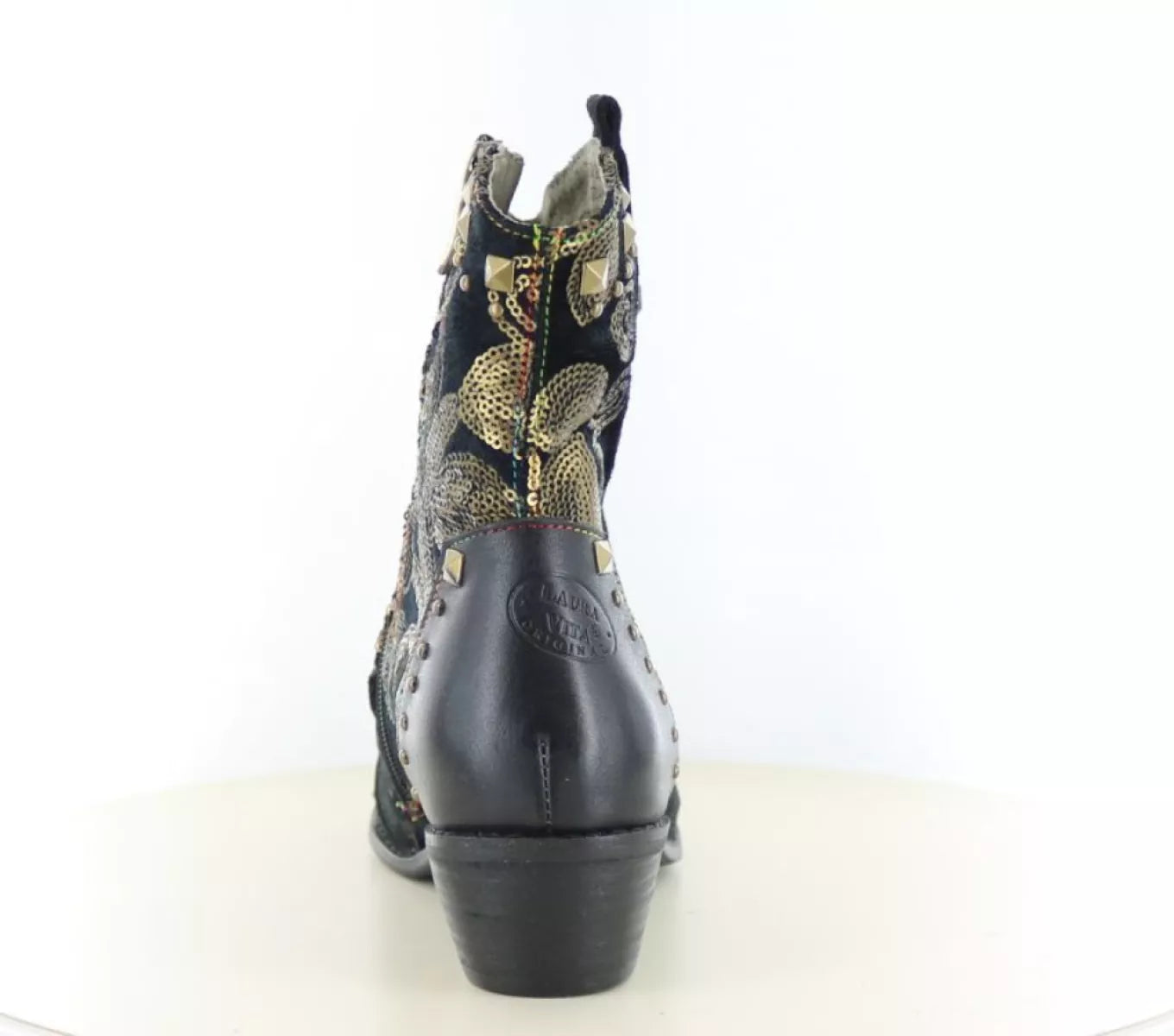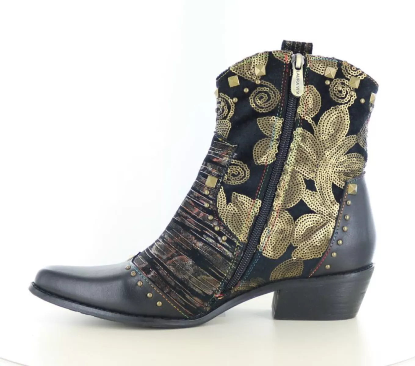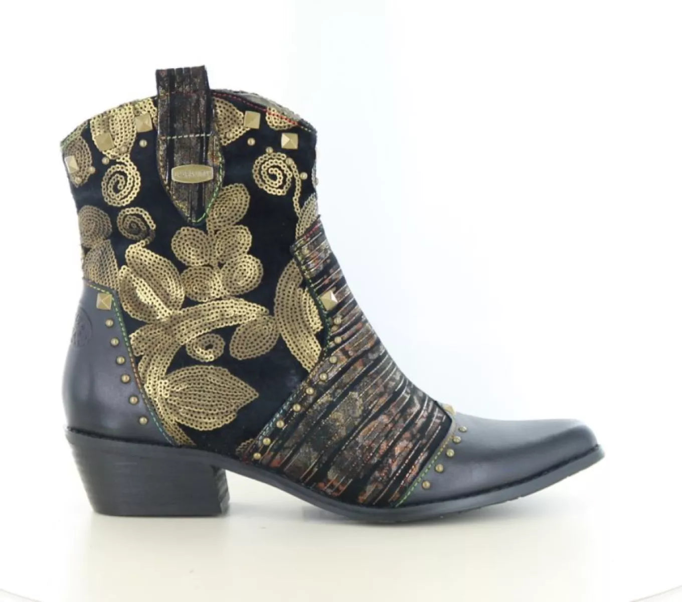 Heben Sie sich mit dem Laura Vita Hicnio 20 Westernstiefel ab – ein echter Hingucker für die moderne Frau mit Mut und Stilbewusstsein. Dieser Stiefel kombiniert klassische Western-Elemente mit einem exotischen goldenen Blumenmuster , metallischen Streifen und einer luxuriösen Mischung aus Leder und Stoff. Das Ergebnis? Ein mutiges und kunstvolles Design, das jedes Outfit sofort aufwertet.