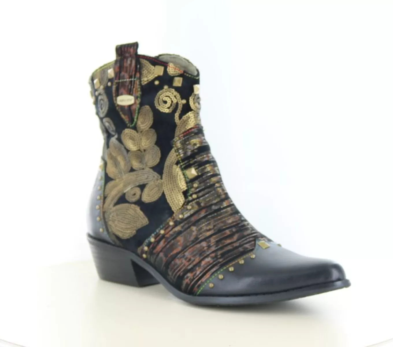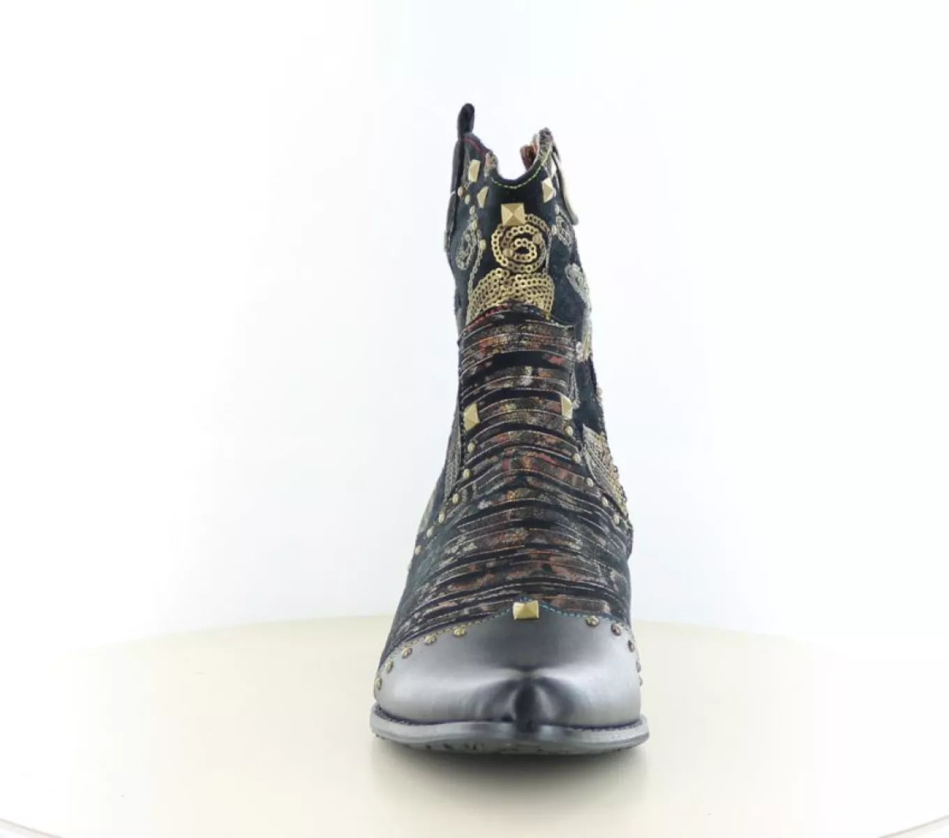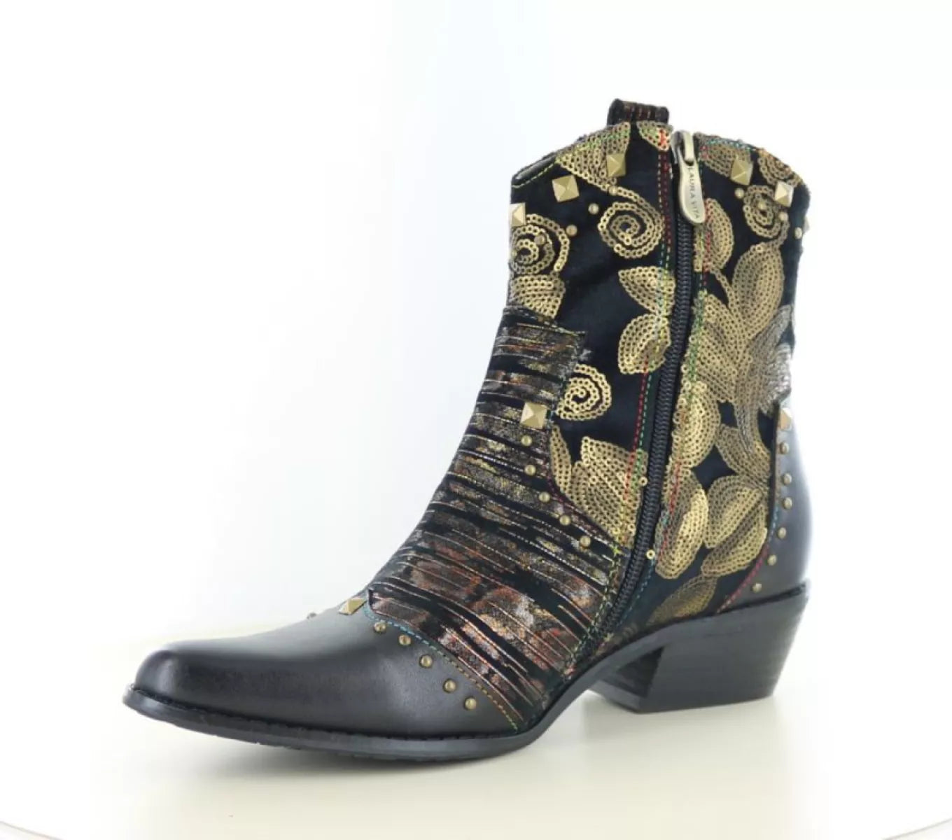 Heben Sie sich mit dem Laura Vita Hicnio 20 Westernstiefel ab – ein echter Hingucker für die moderne Frau mit Mut und Stilbewusstsein. Dieser Stiefel kombiniert klassische Western-Elemente mit einem exotischen goldenen Blumenmuster , metallischen Streifen und einer luxuriösen Mischung aus Leder und Stoff. Das Ergebnis? Ein mutiges und kunstvolles Design, das jedes Outfit sofort aufwertet.