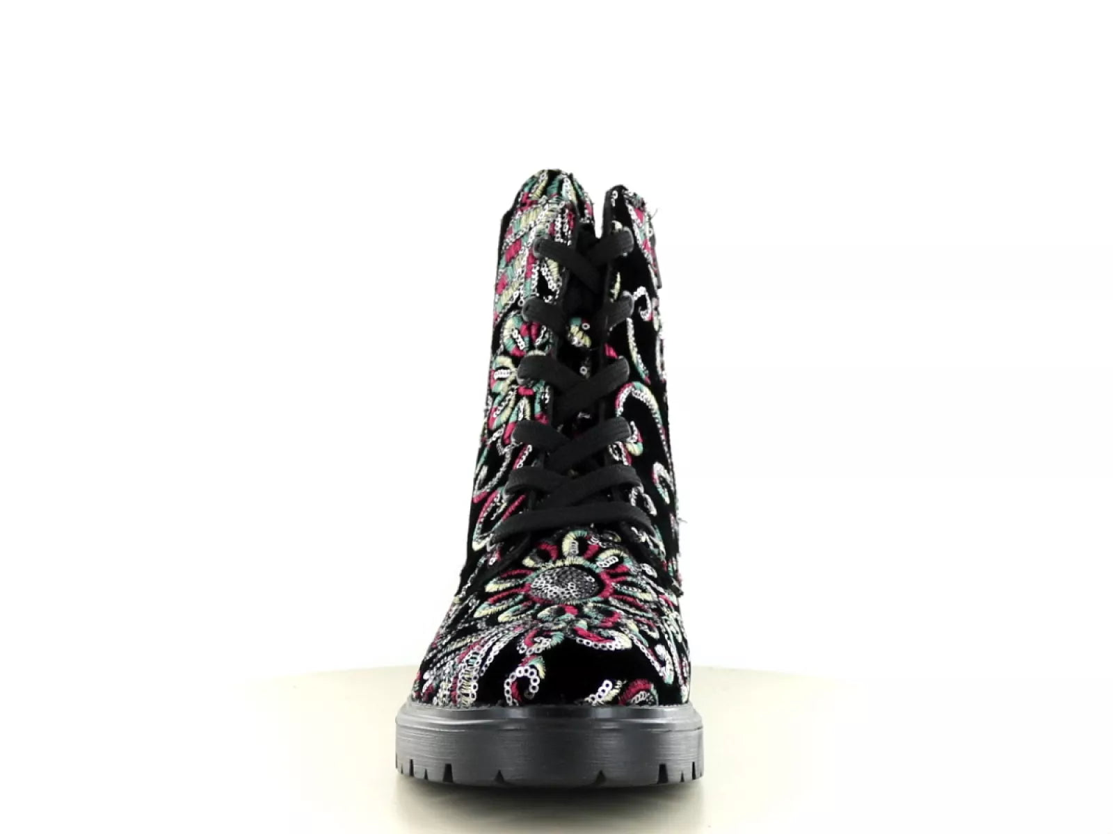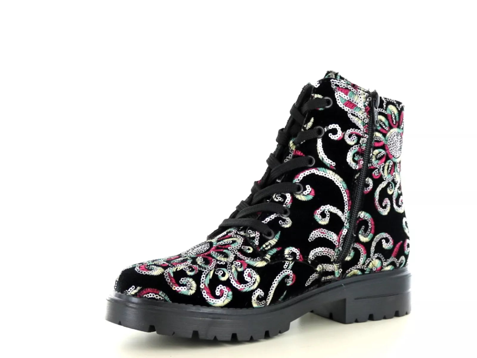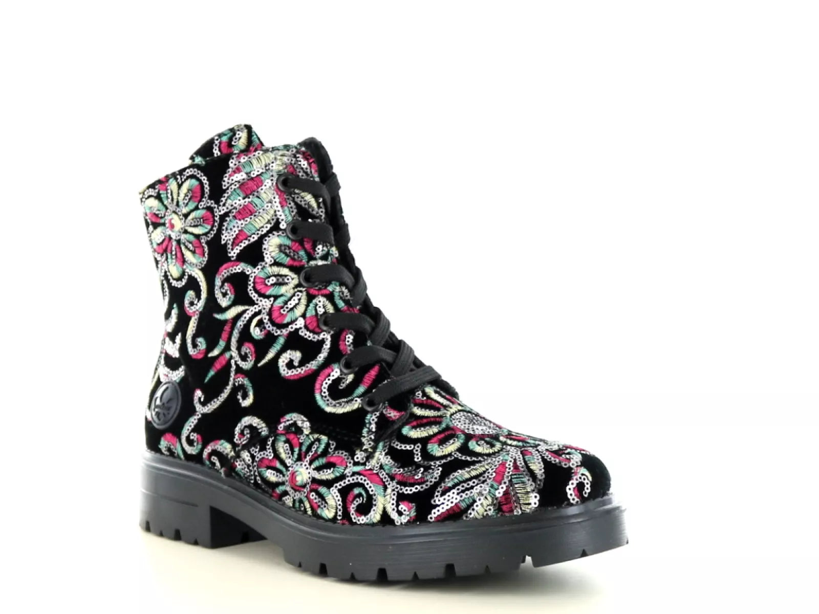 Der Rieker Z2841 ist ein markanter Schnürstiefel, der sich dank seines Komforts und seines einzigartigen Designs ideal für den Alltag eignet. Der Stiefel mit farbenfrohem, wirbelndem Blumenmuster ist aus synthetischem Material gefertigt und dadurch leicht und strapazierfähig. Die Innensohle ist bequem und bietet ausreichend Halt für den Dauereinsatz, während die Gummisohle mit Profil auch auf unebenem Gelände für Halt sorgt.