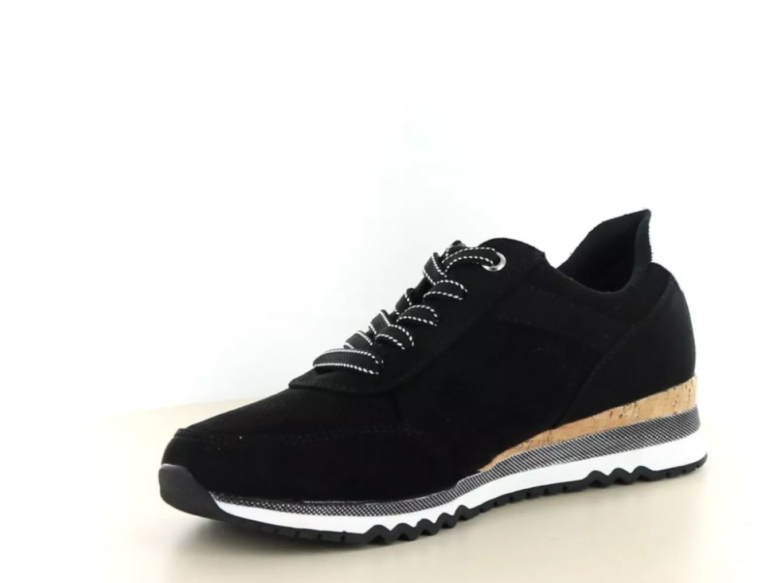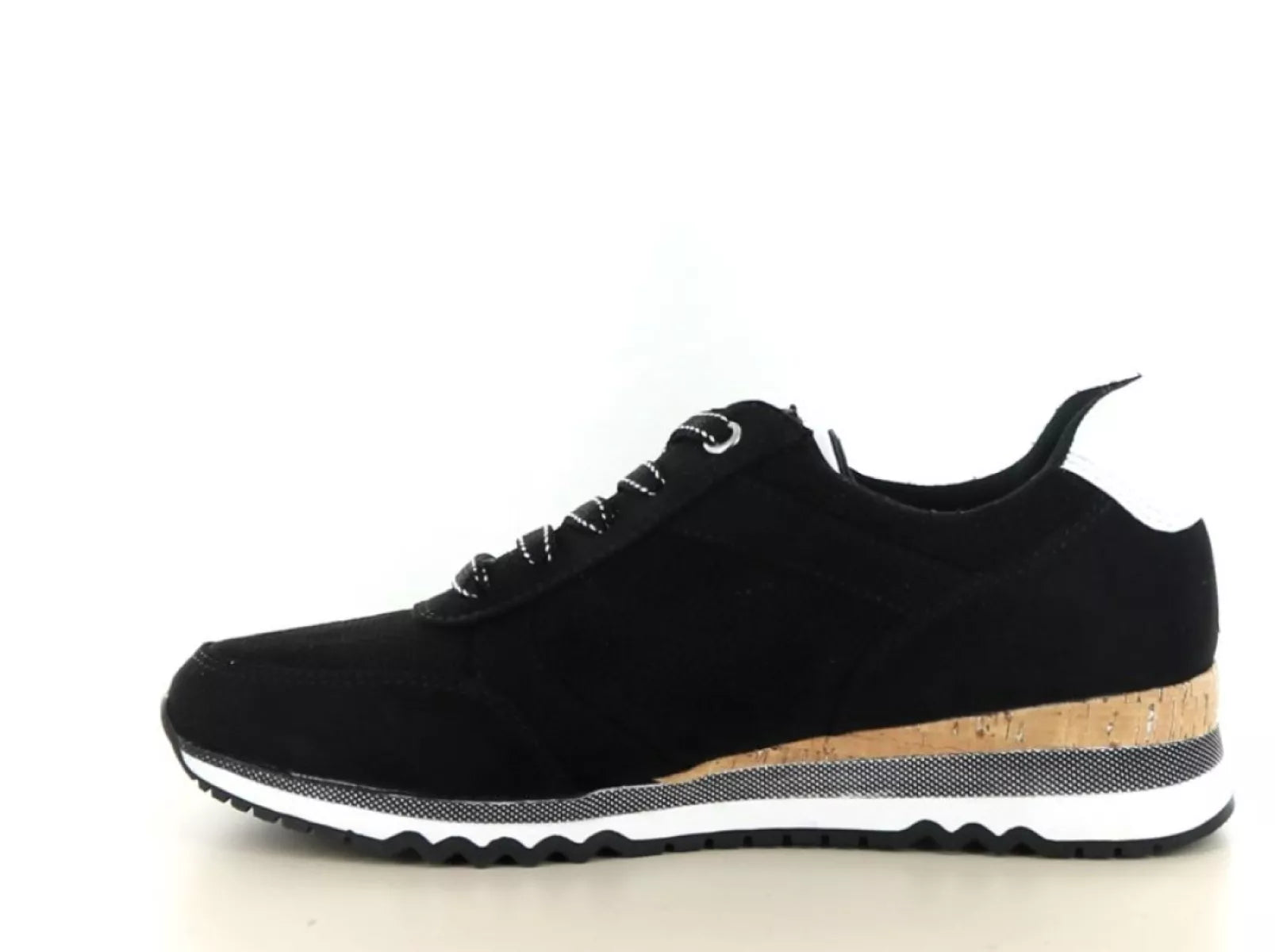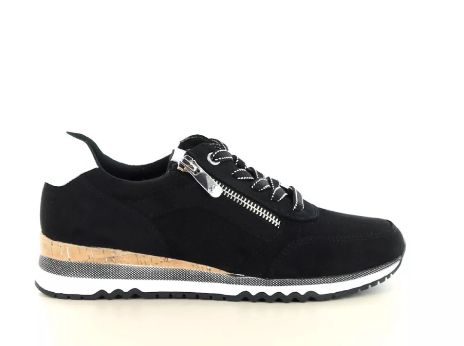 Deze sneaker is uitgevoerd in hoogwaardig imitatiesuède in een klassieke zwart-witte kleurstelling. De subtiele kurklook in de tussenzool en de contrasterende details geven de schoen een moderne, eigentijdse uitstraling. Dankzij de combinatie van veters en een praktische rits trek je de schoen eenvoudig aan en pas je hem perfect aan je voet aan.