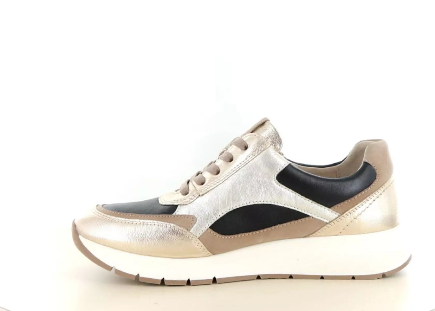 Der Caprice 9/23756 in 091 Black Gold Combi ist ein eleganter Damensneaker mit sportlichem Touch. Die Kombination aus schwarzem Leder, warmen Beigetönen und dezenten goldenen Akzenten verleiht ihm einen luxuriösen und modischen Look. Dieser Sneaker ist perfekt für Frauen, die Komfort mit einem stilvollen, modernen Stil verbinden möchten.