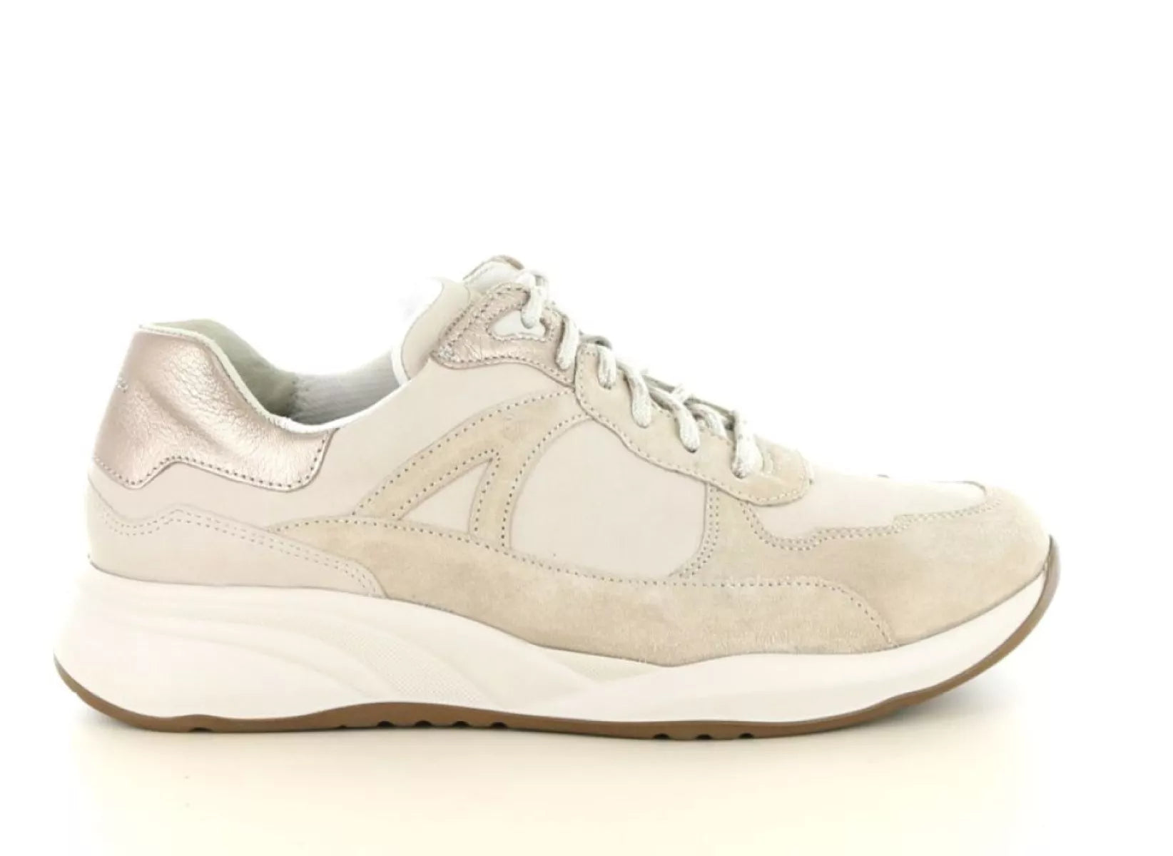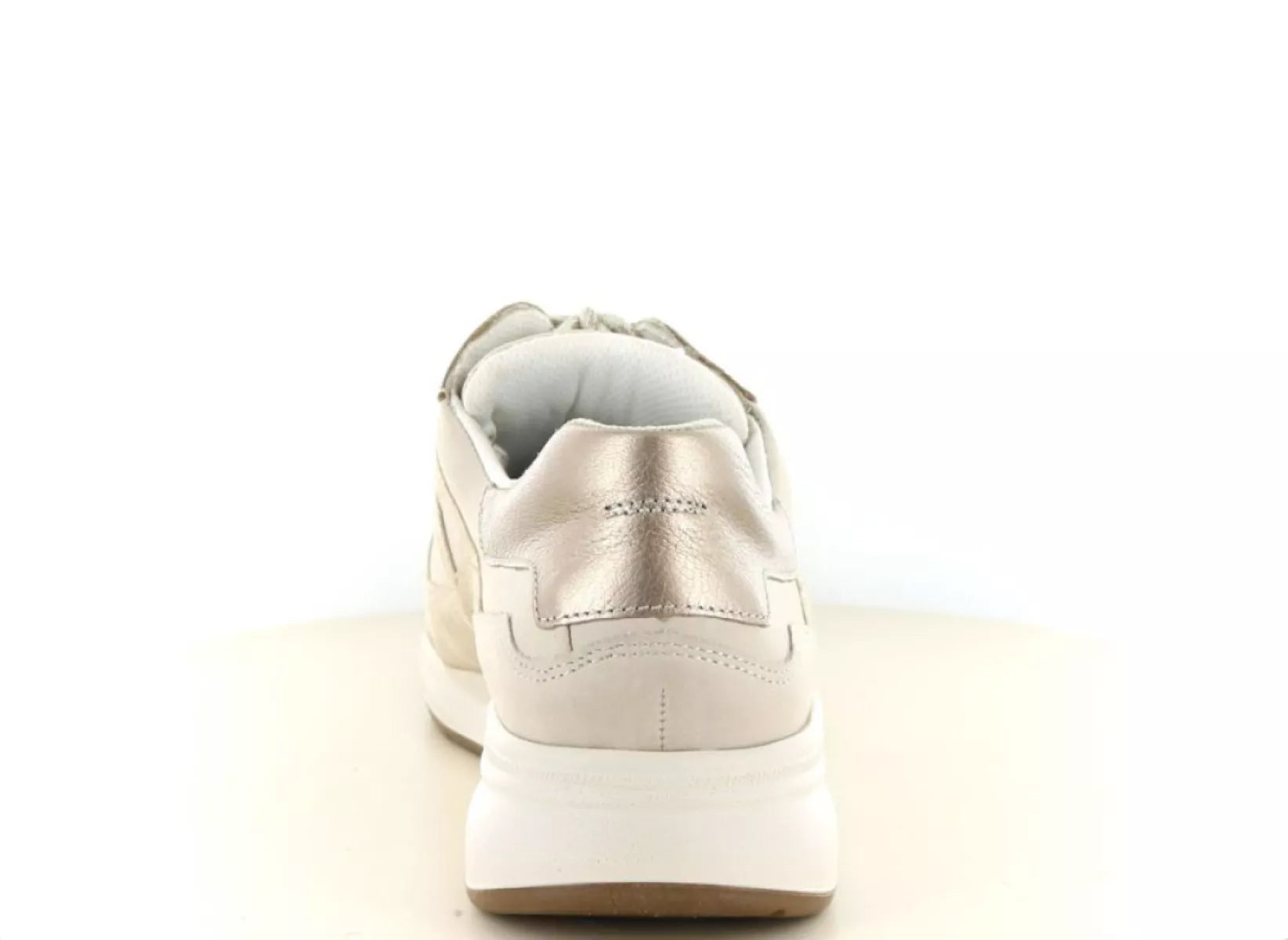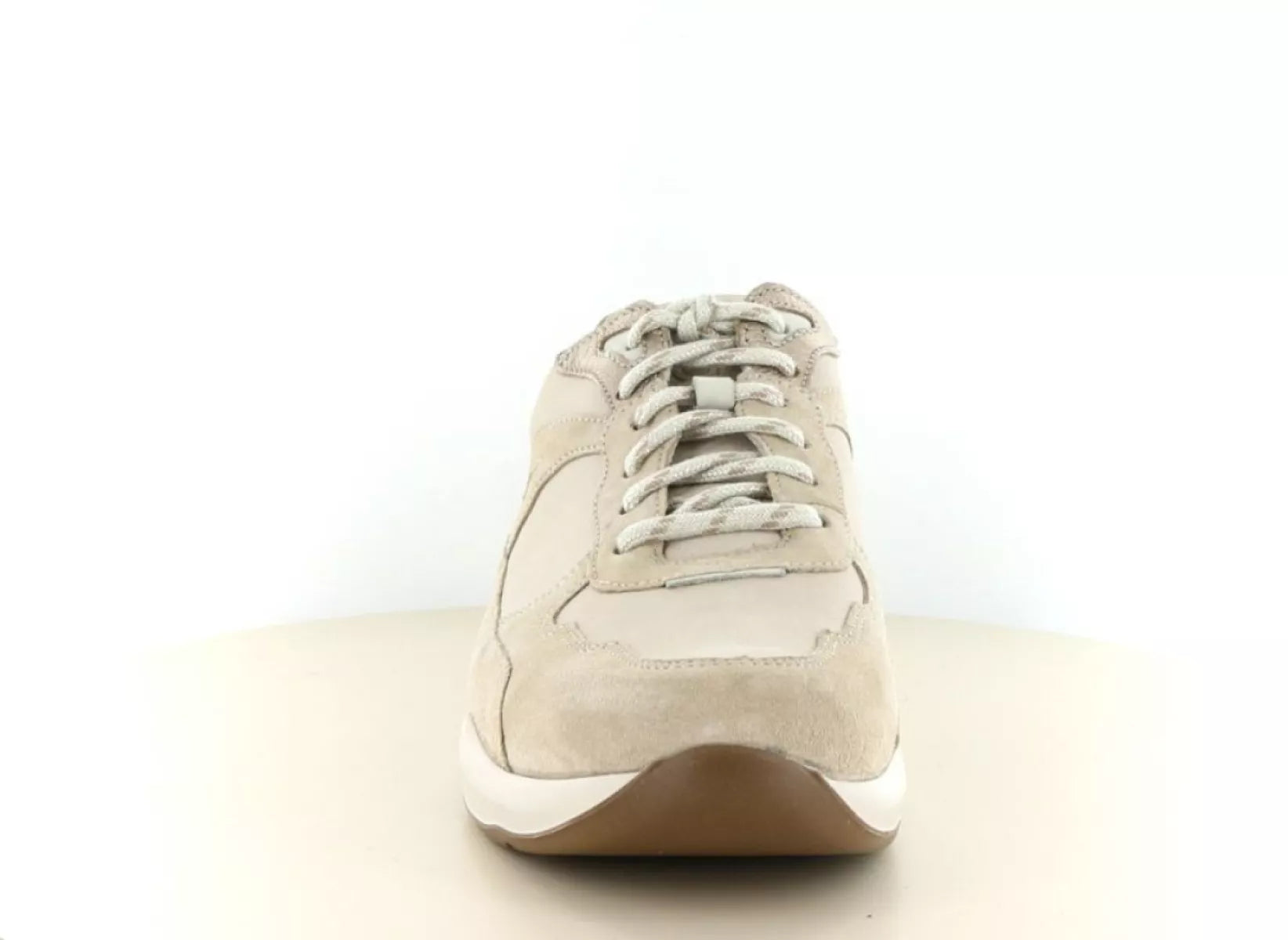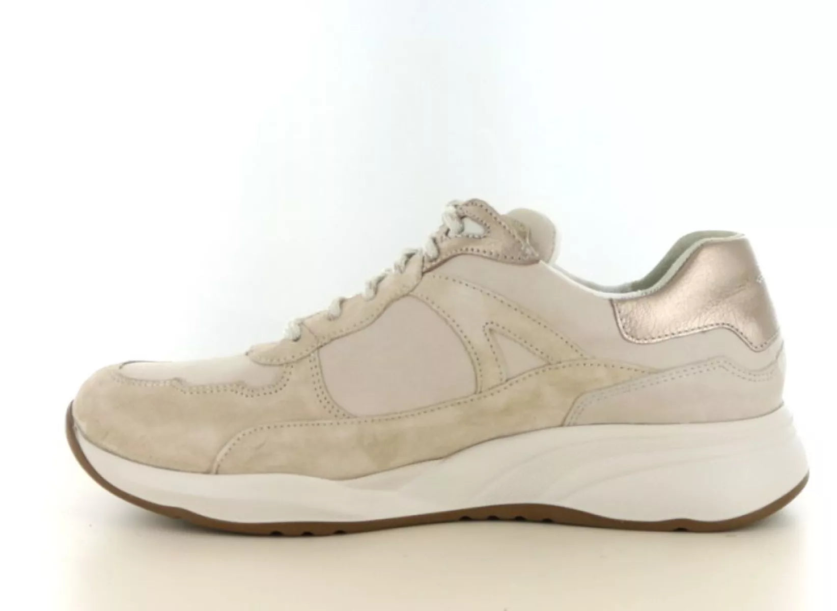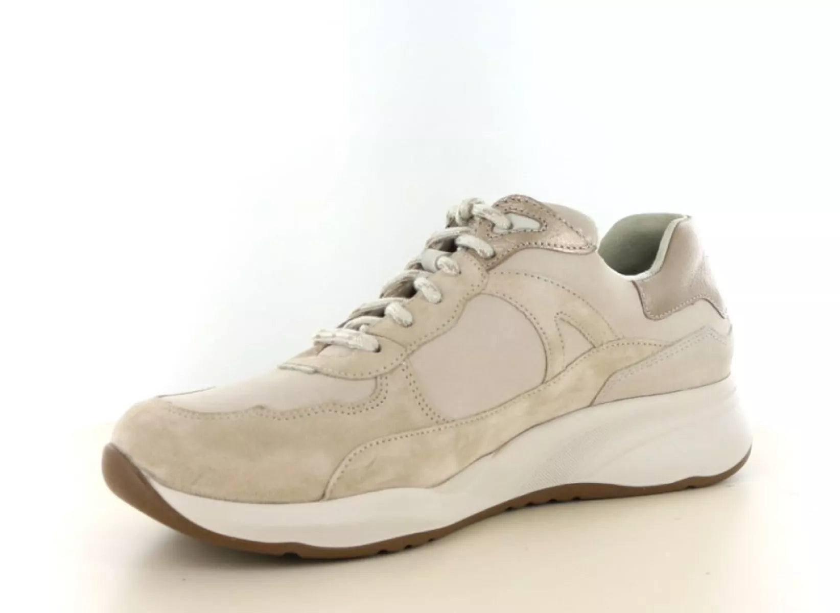 Die Kombination aus geschmeidigem Leder und weichem Veloursleder in Taupe-Tönen verleiht diesem Damenschuh einen modernen, eleganten Look. Dezente Metallic-Akzente an der Ferse setzen einen zeitgemäßen Akzent. Dank der robusten und dennoch leichten Sohle genießen Sie bei jedem Schritt hervorragende Dämpfung – perfekt für einen Tag voller Spaziergänge, Shopping oder Arbeit.