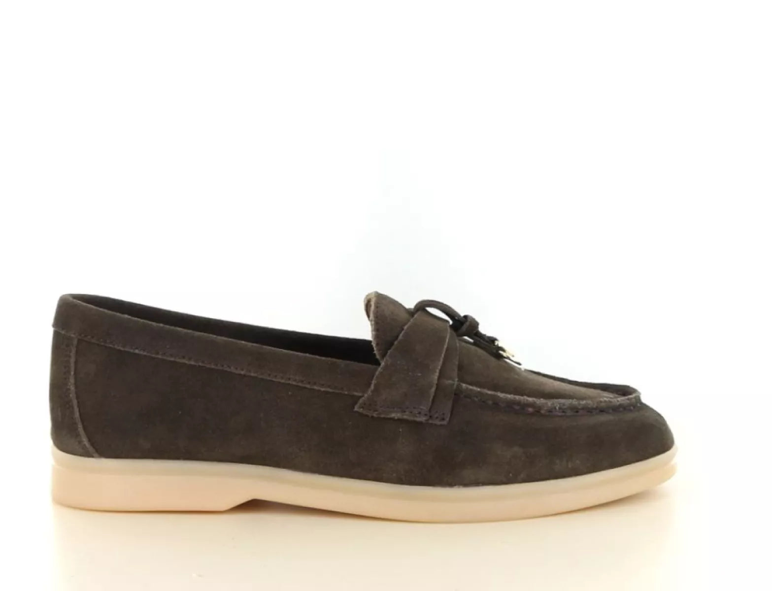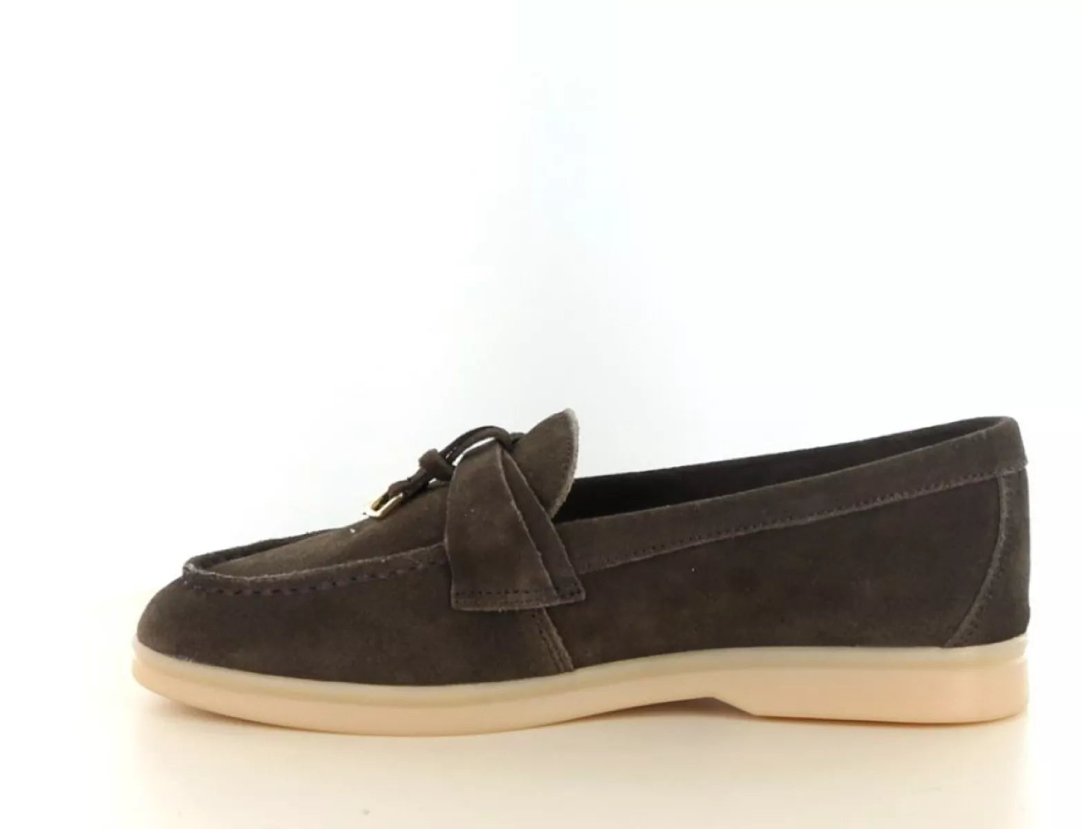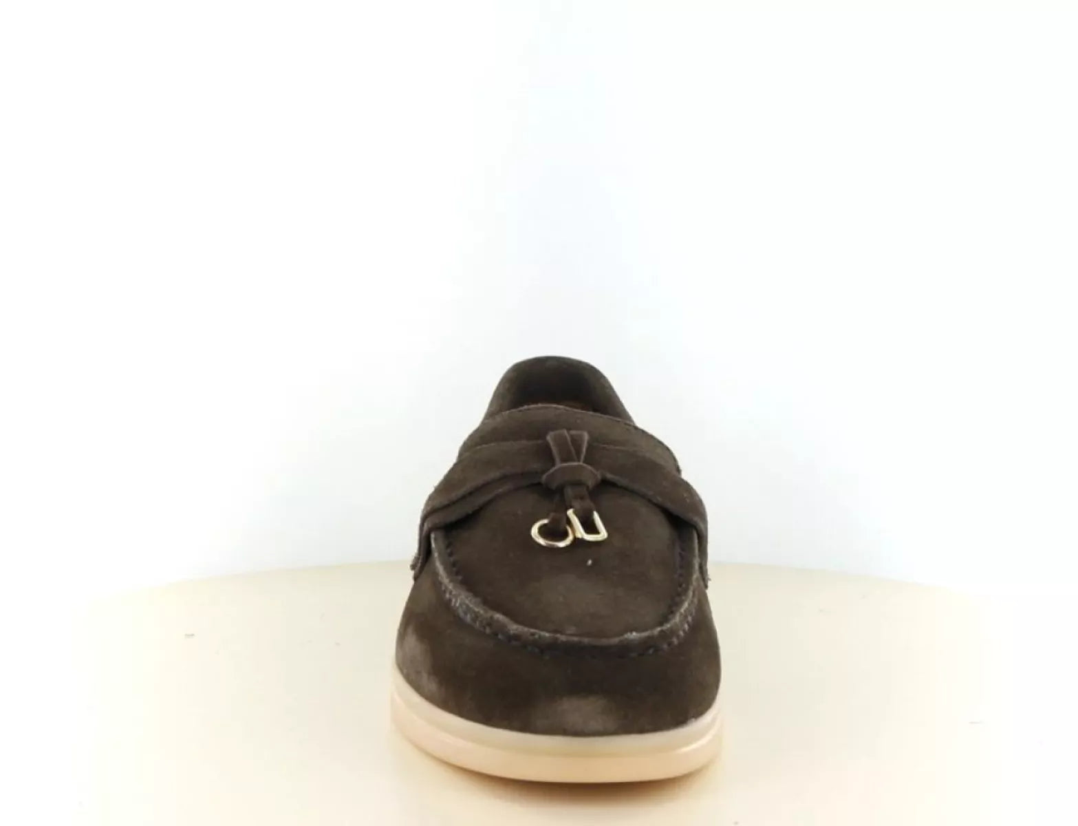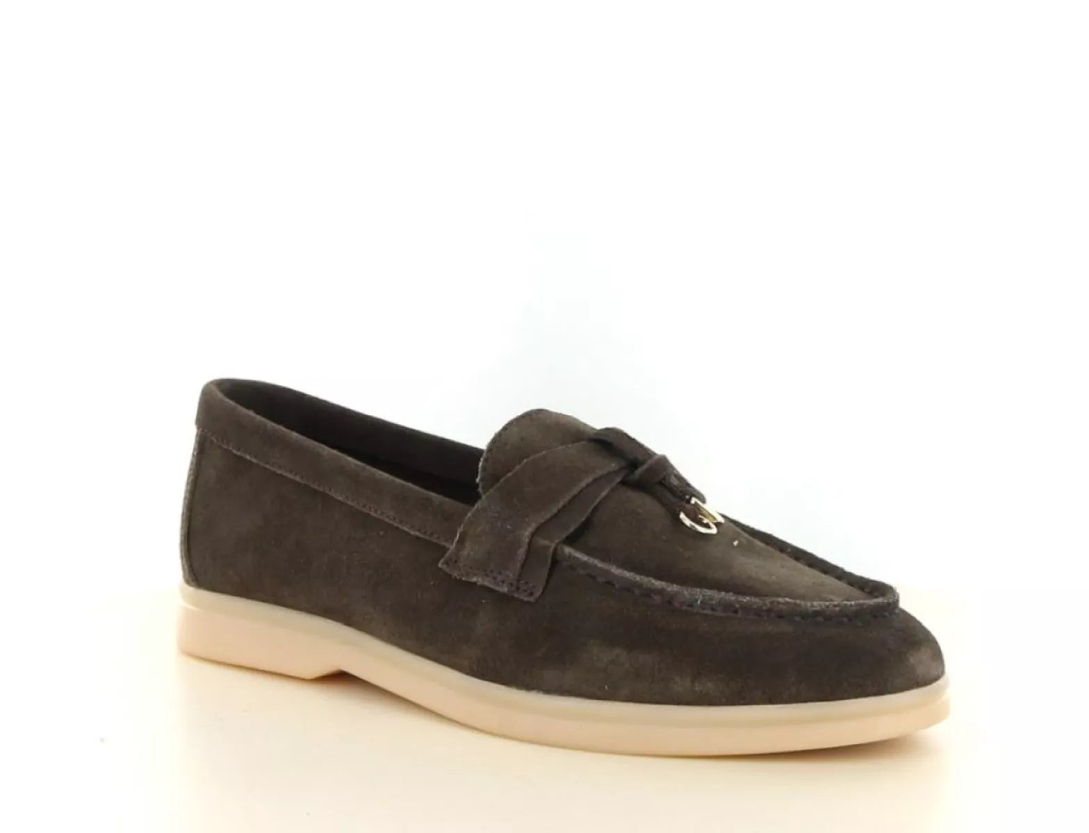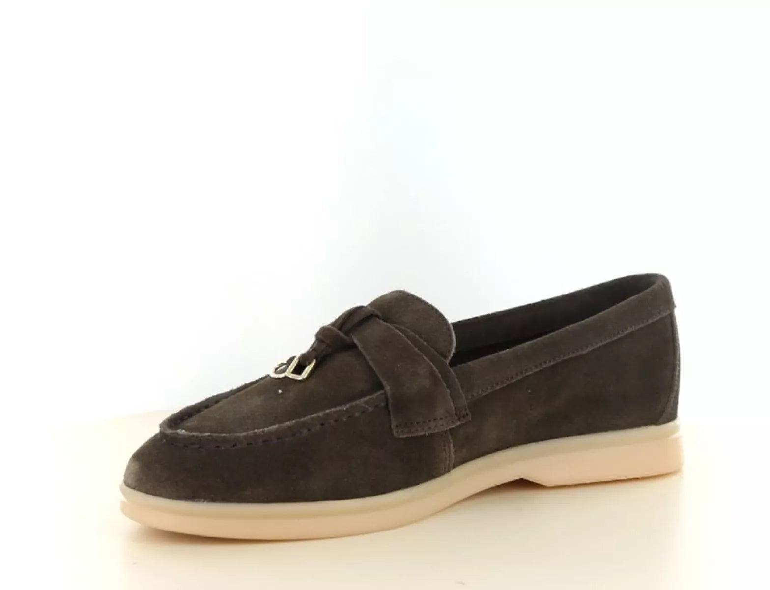 Das Obermaterial besteht aus weichem Wildleder in einem tiefen, dunklen Braunton. Der dezente Riemen am Spann mit edlen Golddetails verleiht diesem Damen-Loafer einen luxuriösen Look. Die helle, cremefarbene Sohle bildet einen schönen Kontrast und verleiht dem Schuh eine frische, moderne Note.