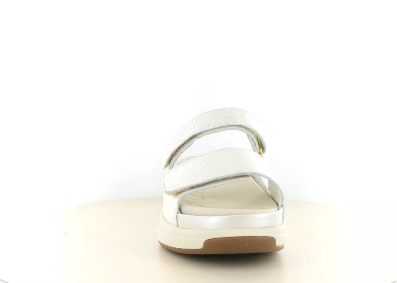 Das Obermaterial besteht aus geschmeidigem Leder mit einem dezenten Print und leichtem Glanz. Der neutrale Farbton Soft Pearl harmoniert perfekt mit Sommerkleidern und luftigen Hosen. Die robuste, leichte Sohle sorgt für Stabilität und Halt, während das Design modern und feminin wirkt.
