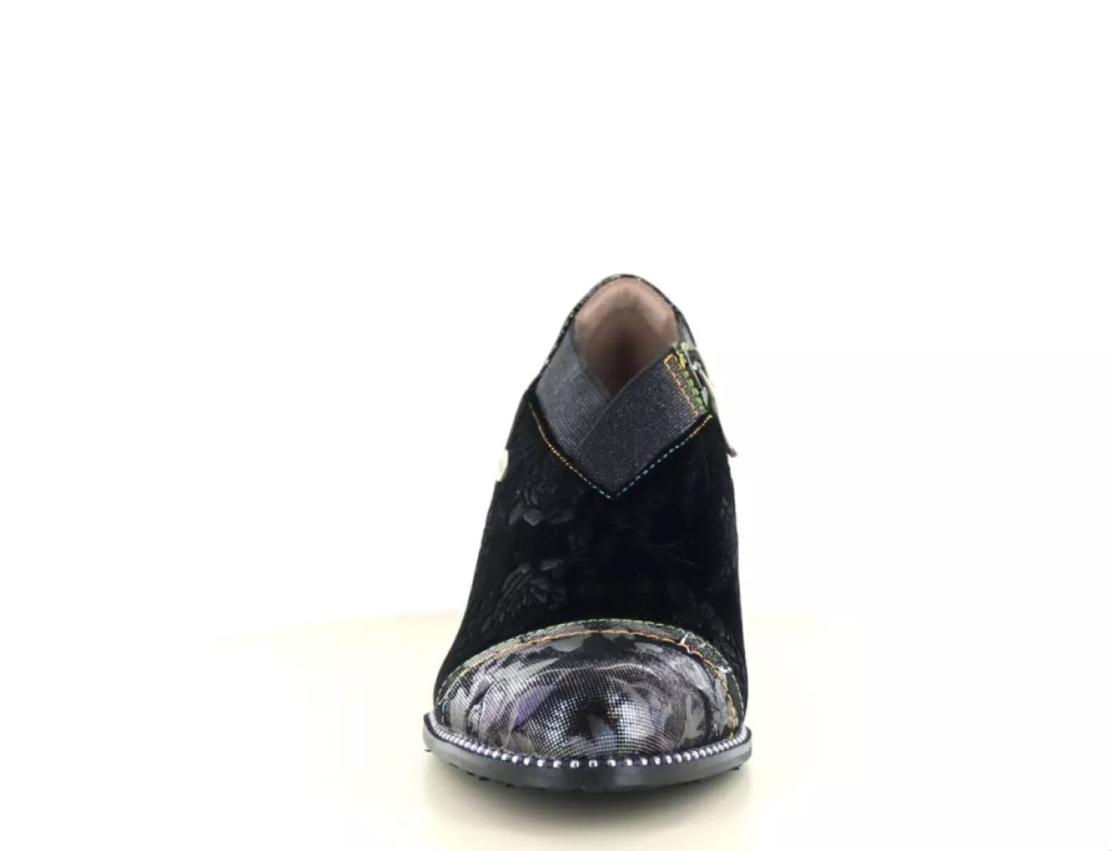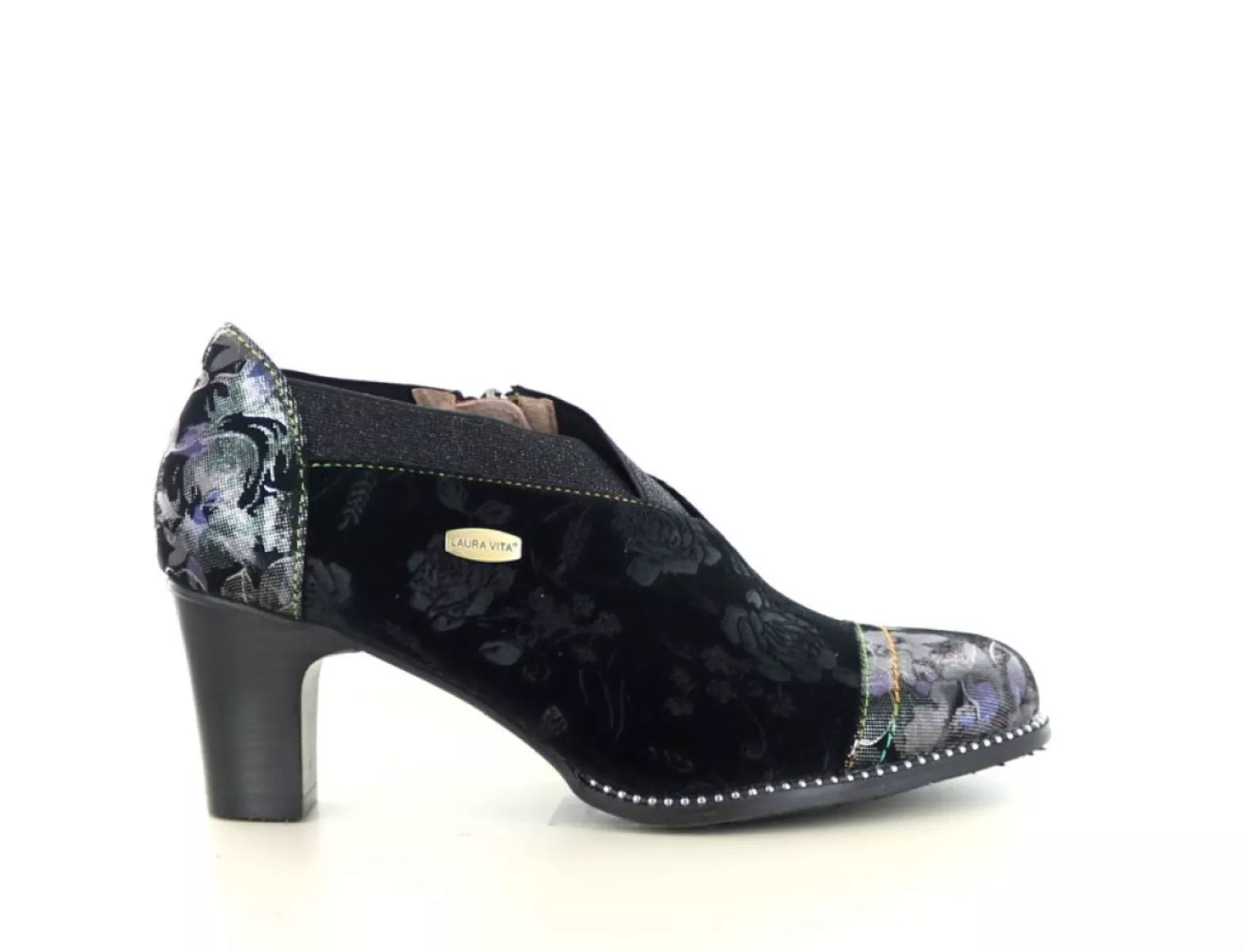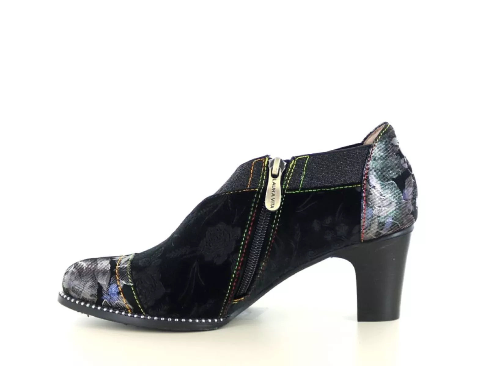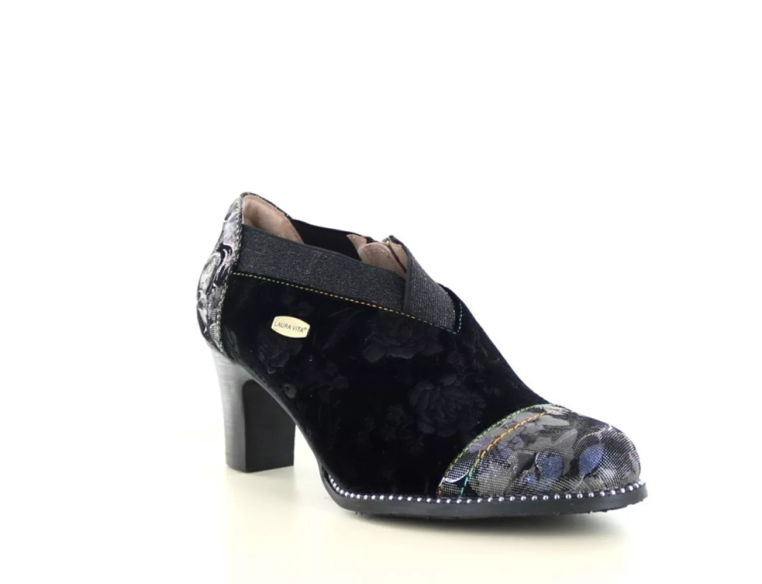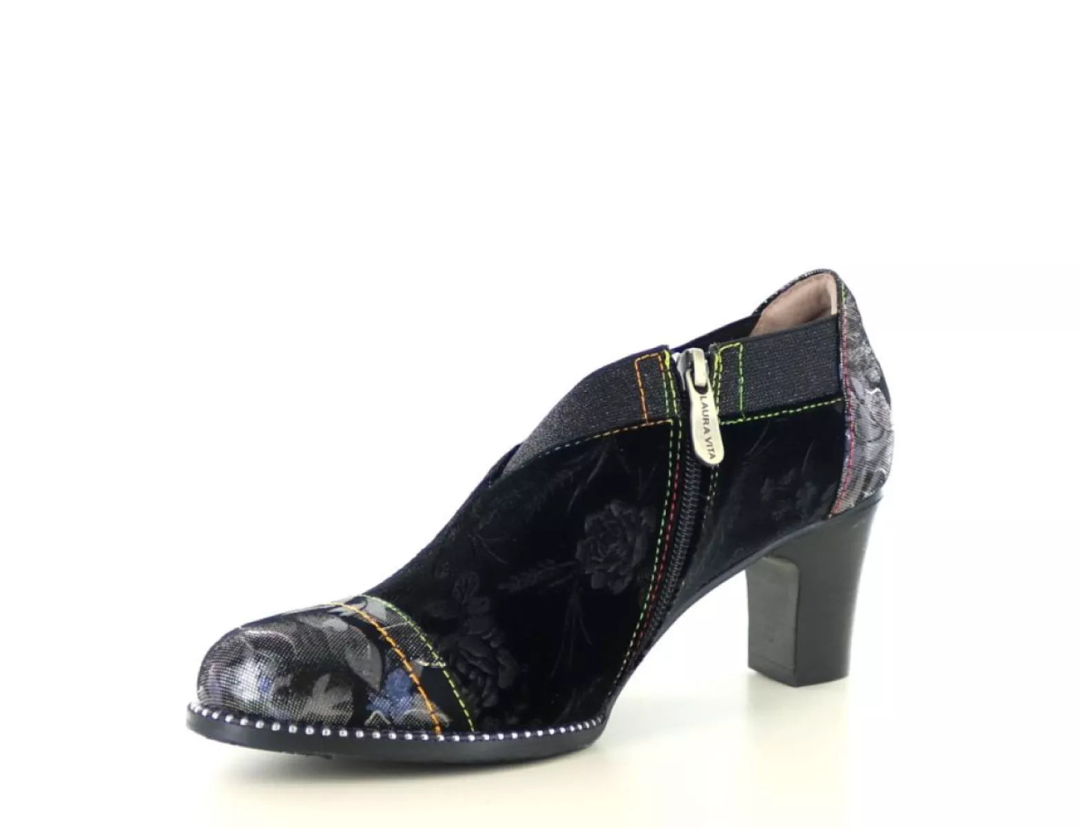 Setzen Sie ein starkes Style-Statement mit dem Laura Vita Elcodieo 42 , einem eleganten Pumps mit geschlossener Spitze , der mühelos Weiblichkeit, Charakter und Komfort vereint. Dieser einzigartige Damenschuh aus geschmeidigem Leder mit Textilakzenten ist reich verziert mit einem dezenten Blumenmuster in Hellbraun/Schwarz und einem metallischen Glanz für ein künstlerisches Flair.