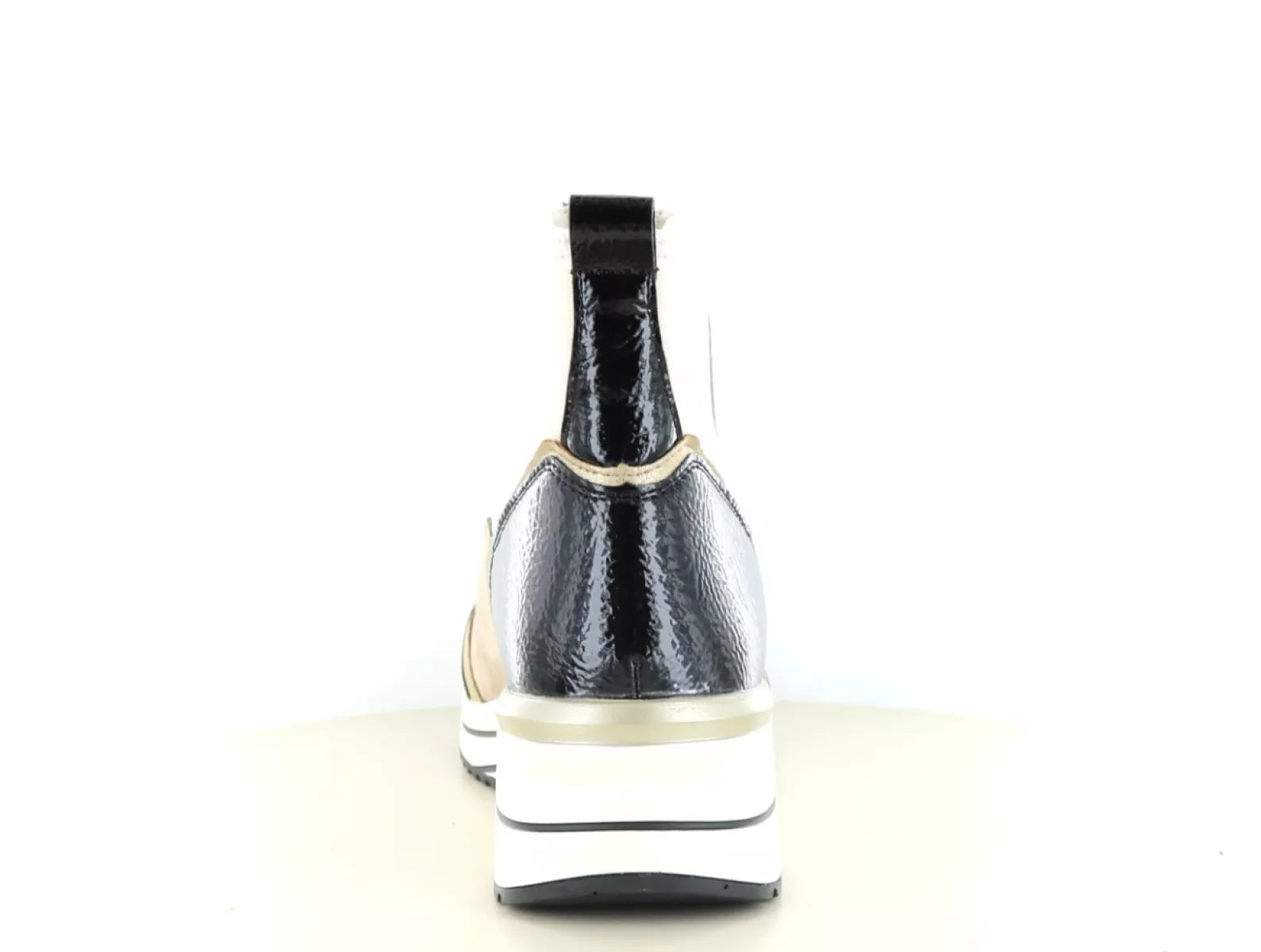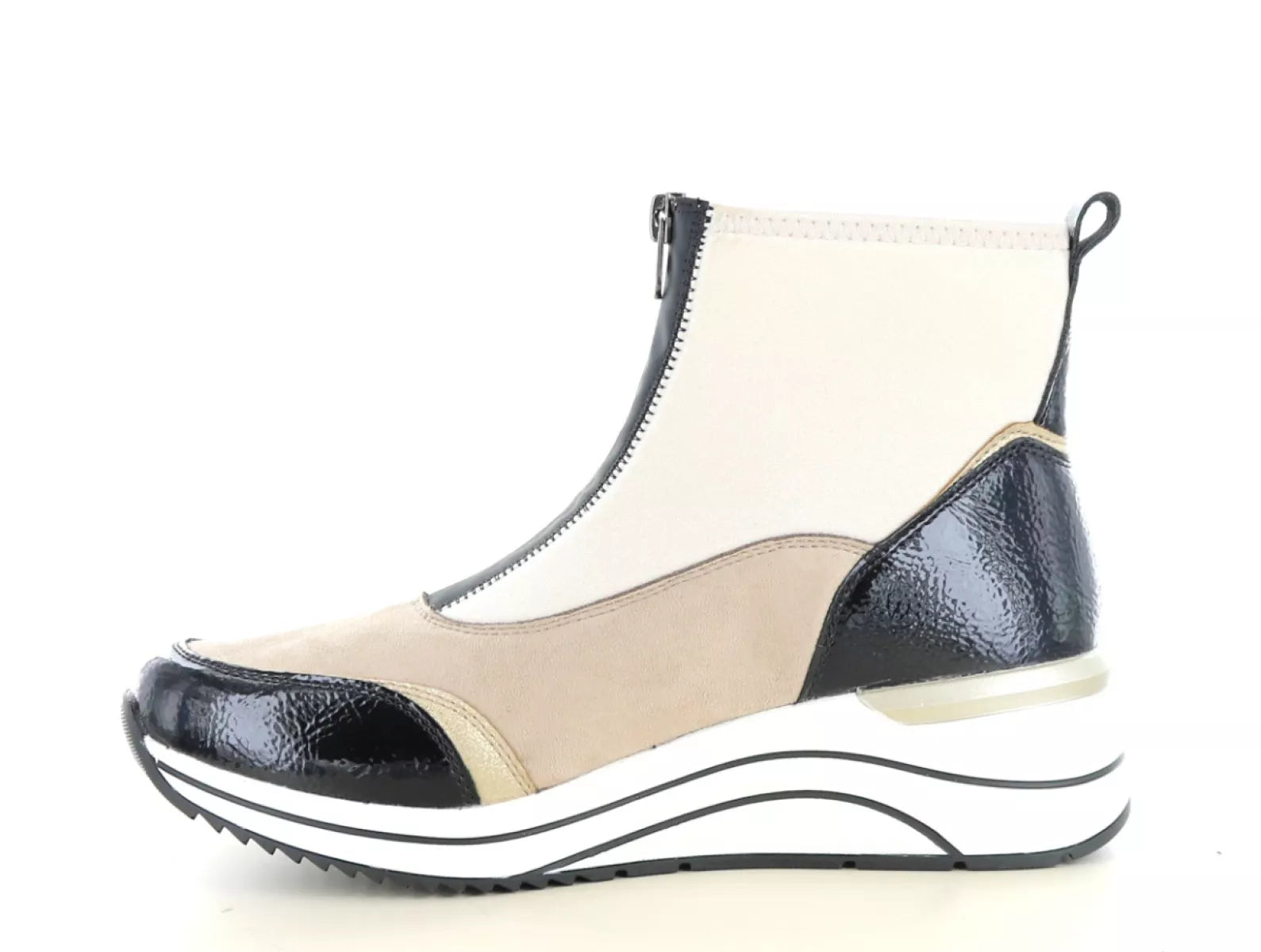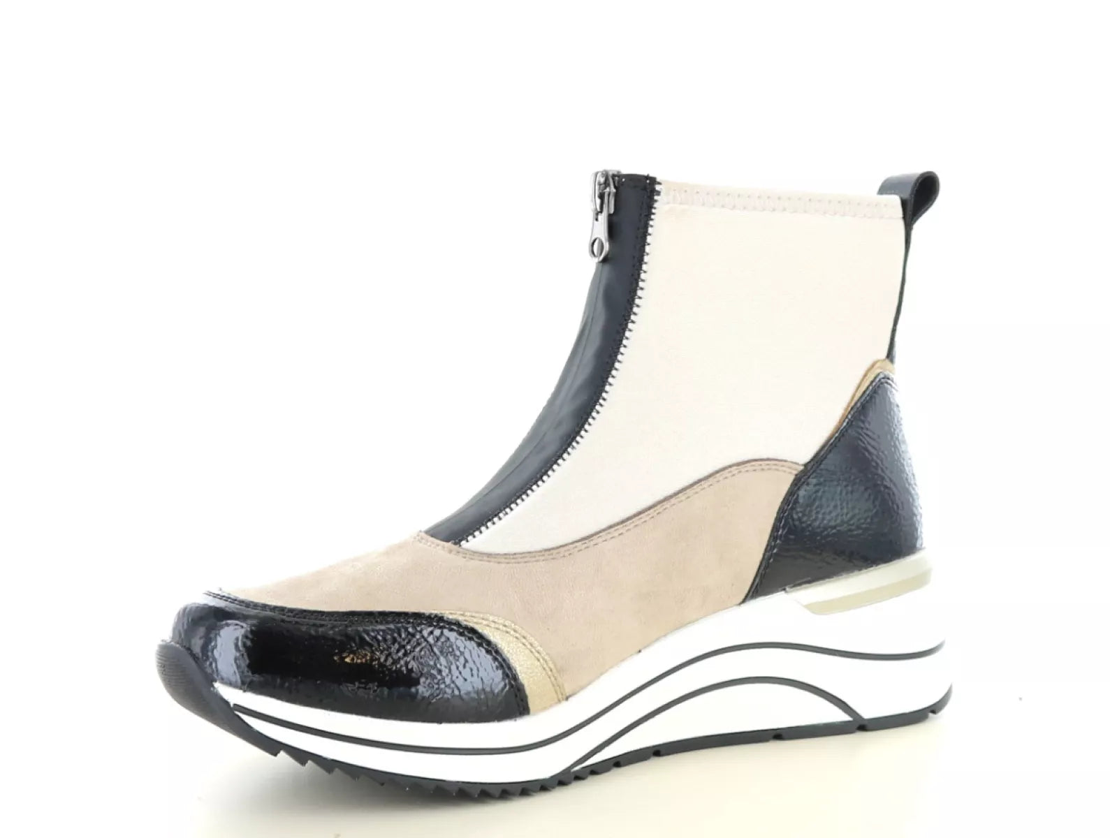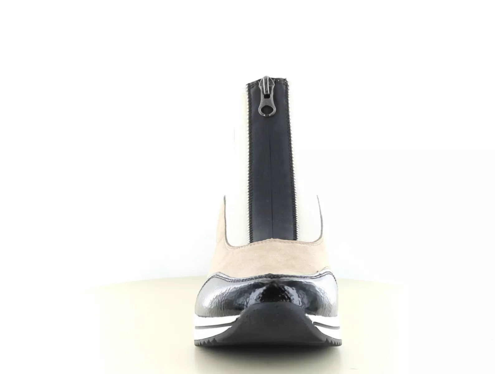 Der Remonte D0T78 Ankle Boot in Schwarz/Jute ist ein echter Hingucker für Damen, die Stil und Komfort vereinen möchten. Der verspielte Farbkontrast aus Schwarz, Beige und dezenten Metallic-Akzenten verleiht dem Schuh einen sportlich-modernen Look. Dank des praktischen Reißverschlusses lässt sich der Boot bequem an- und ausziehen, während die bequeme Weite G (Regular Fit) und das Wechselfußbett für optimalen Tragekomfort sorgen – auch für orthopädische Einlagen geeignet.