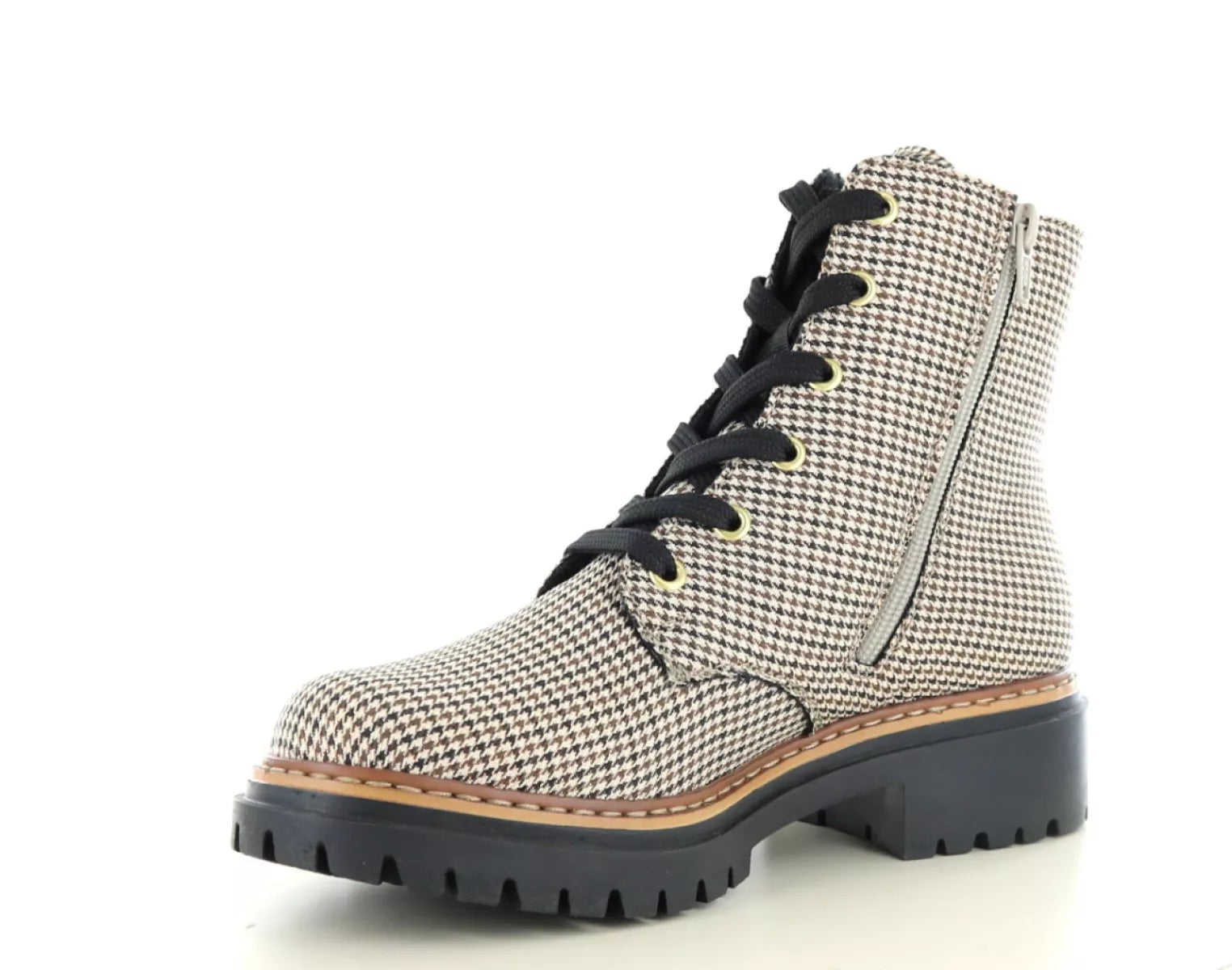 Der Rieker 72617 ist ein stylischer Mid-Cut-Schnürstiefel für Damen, der Mode und Komfort mühelos vereint. Mit seinem einzigartigen beige-schwarzen Karomuster ist dieser Stiefel ein echter Hingucker und verleiht Ihrem Look sofort eine modische Note. Das robuste und flexible Cambrelle-Material fühlt sich angenehm an und bietet atmungsaktiven Komfort, der Ihre Füße den ganzen Tag lang frisch hält.