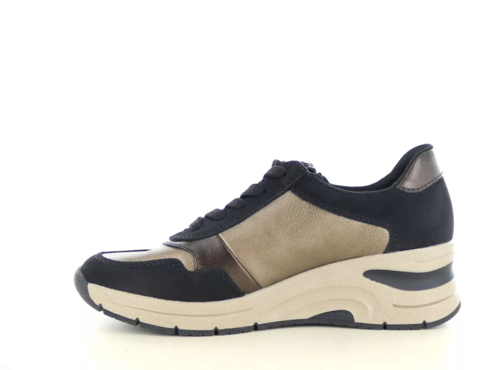 Der Rieker N9301 in Schwarz/Bronze ist die perfekte Wahl für alle, die Komfort, Bequemlichkeit und einen stilvollen Look kombinieren möchten. Der Damen-Sneaker strahlt dank der metallischen Bronze in Kombination mit tiefem Schwarz sportliche Eleganz aus. Ideal für jeden Tag – egal ob Sie in der Stadt unterwegs sind oder lässig gekleidet sind.