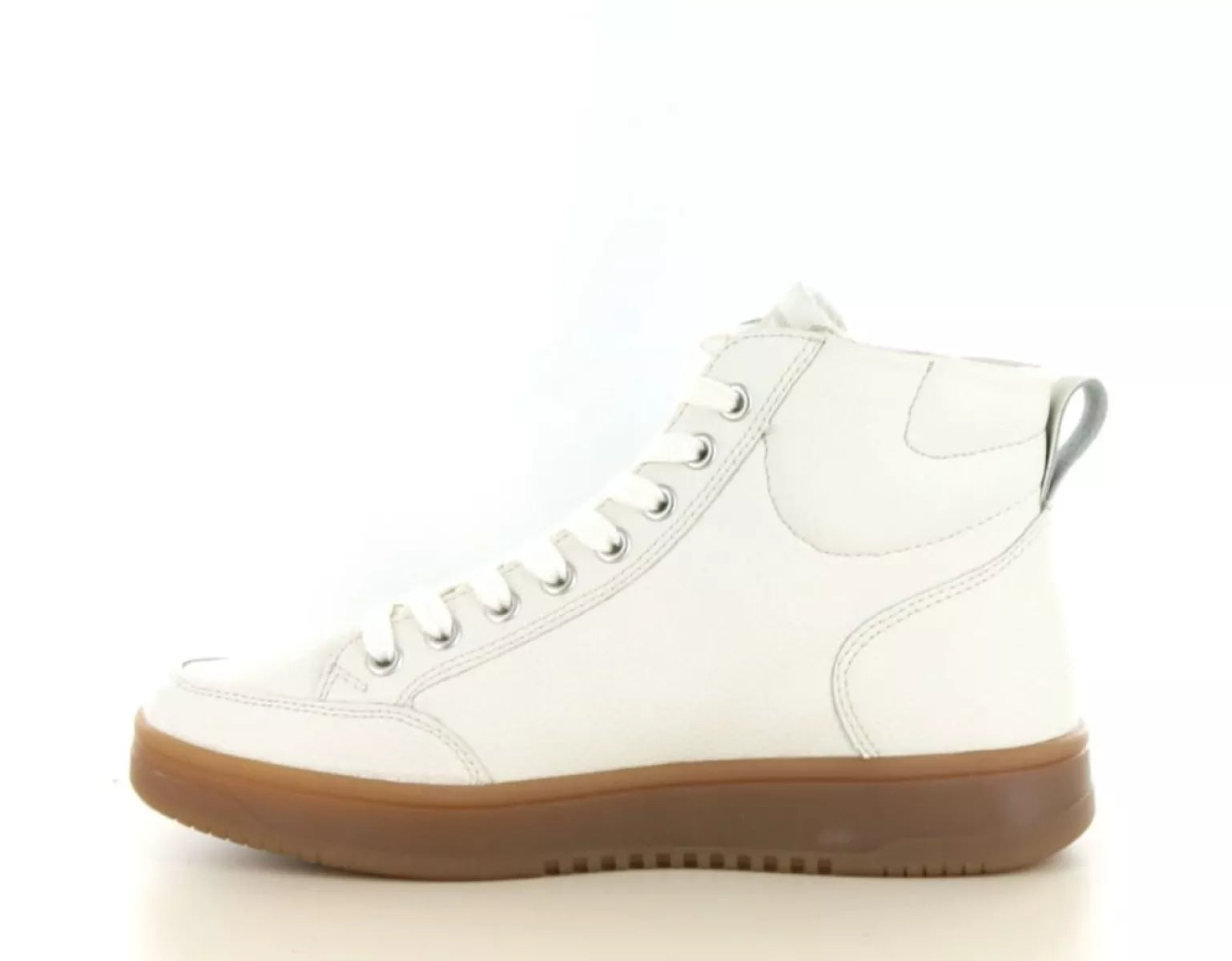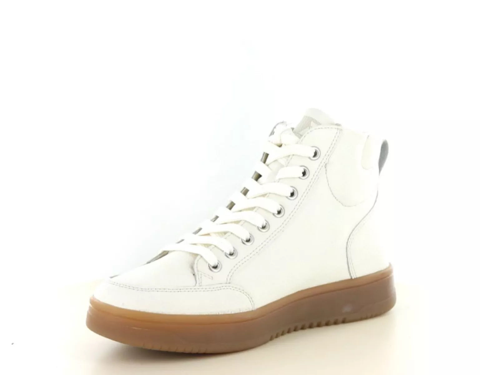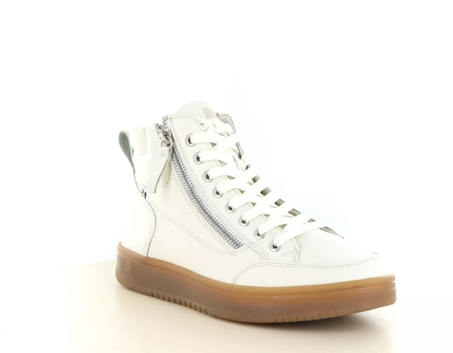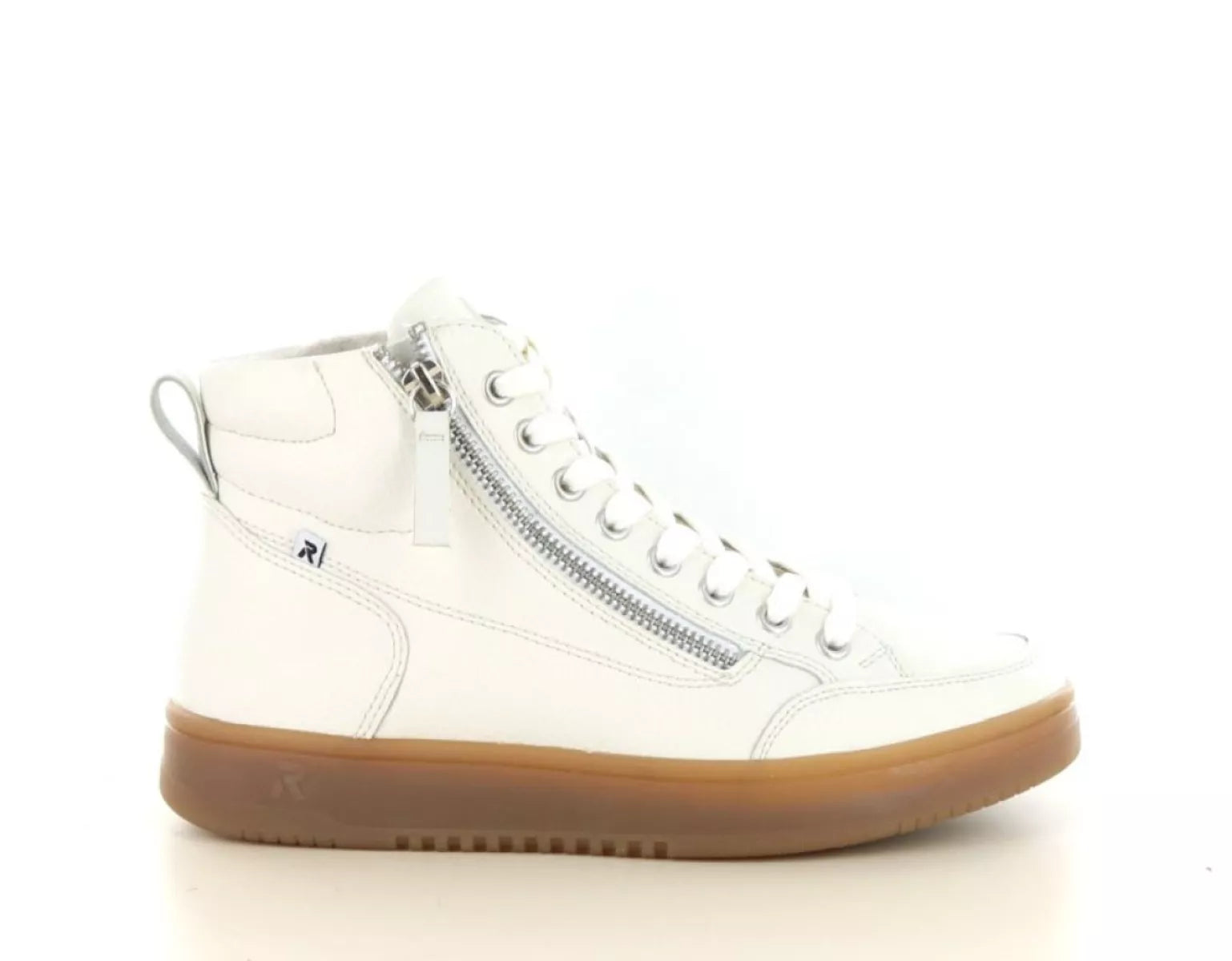 Vervollständigen Sie Ihr Outfit mit dem Rieker W1971 Damen-Schnürschuh . Dieser stylische High-Top-Sneaker aus knackig weißem Leder kombiniert einen sportlichen Look mit dem unvergleichlichen Tragekomfort, den Sie von Rieker gewohnt sind. Die warme cognacfarbene Sohle setzt einen trendigen Kontrast und eignet sich sowohl für die Freizeit als auch für formelle Anlässe.