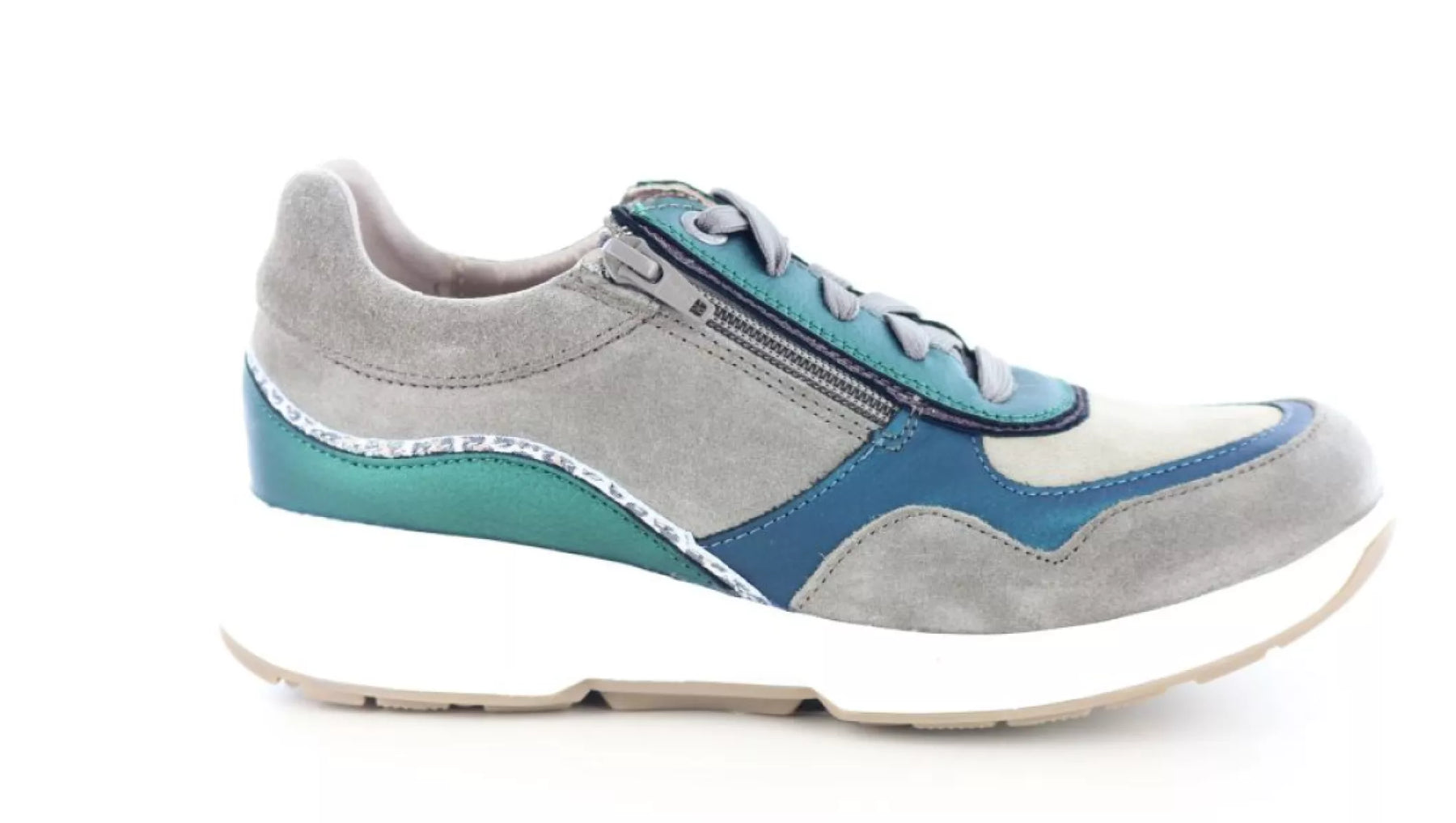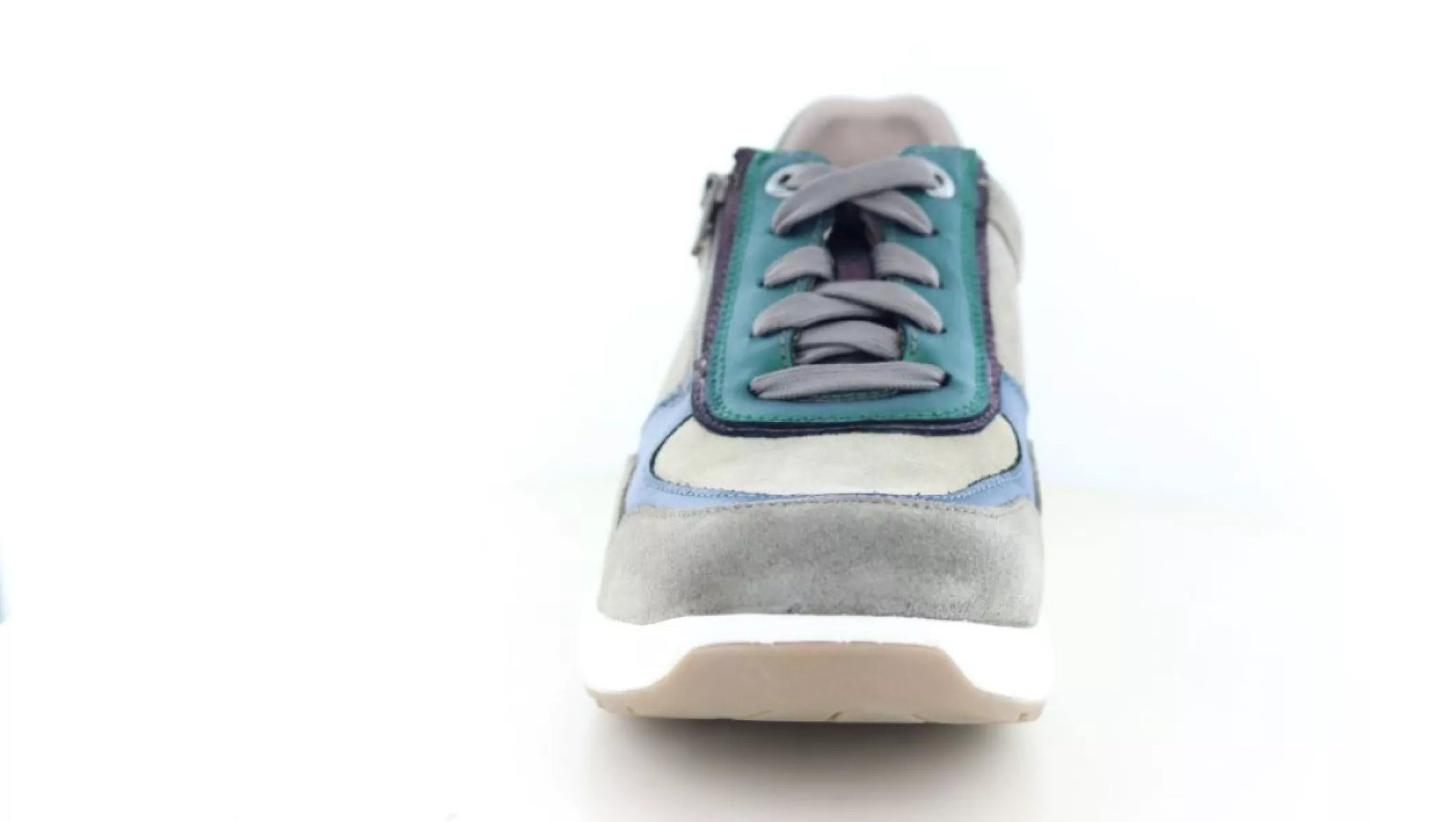 Das Obermaterial aus einer luxuriösen Kombination von Leder und Wildleder in Taupe-, Blau- und Grüntönen verleiht dem Sneaker einen modernen und sportlichen Look. Dank des Schnürverschlusses und des praktischen Reißverschlusses lässt sich der Schuh leicht an- und ausziehen.