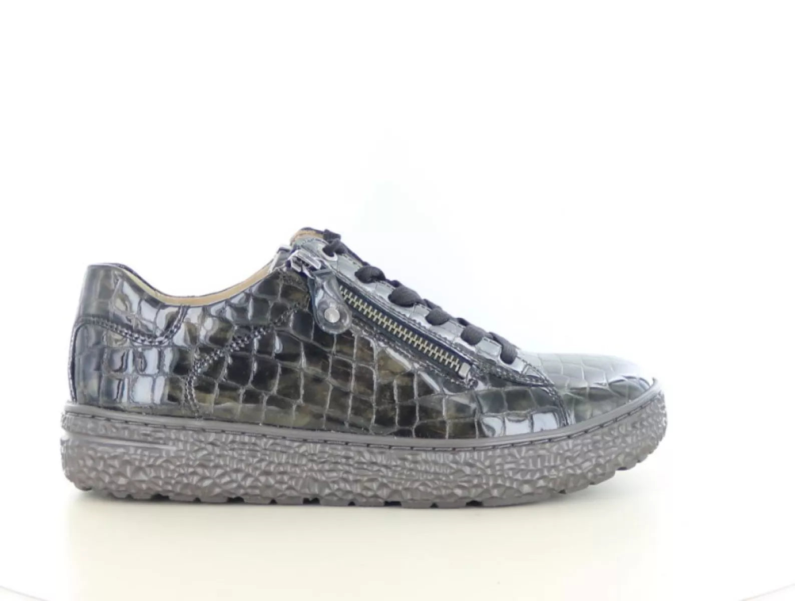 Dank der Kombination aus Schnürsenkeln und Reißverschluss lässt sich der Schuh leicht anziehen und passt sich perfekt Ihrem Fuß an. Die Weite H bietet zusätzlichen Platz für breitere Füße, ohne Kompromisse bei Stil oder Halt einzugehen.