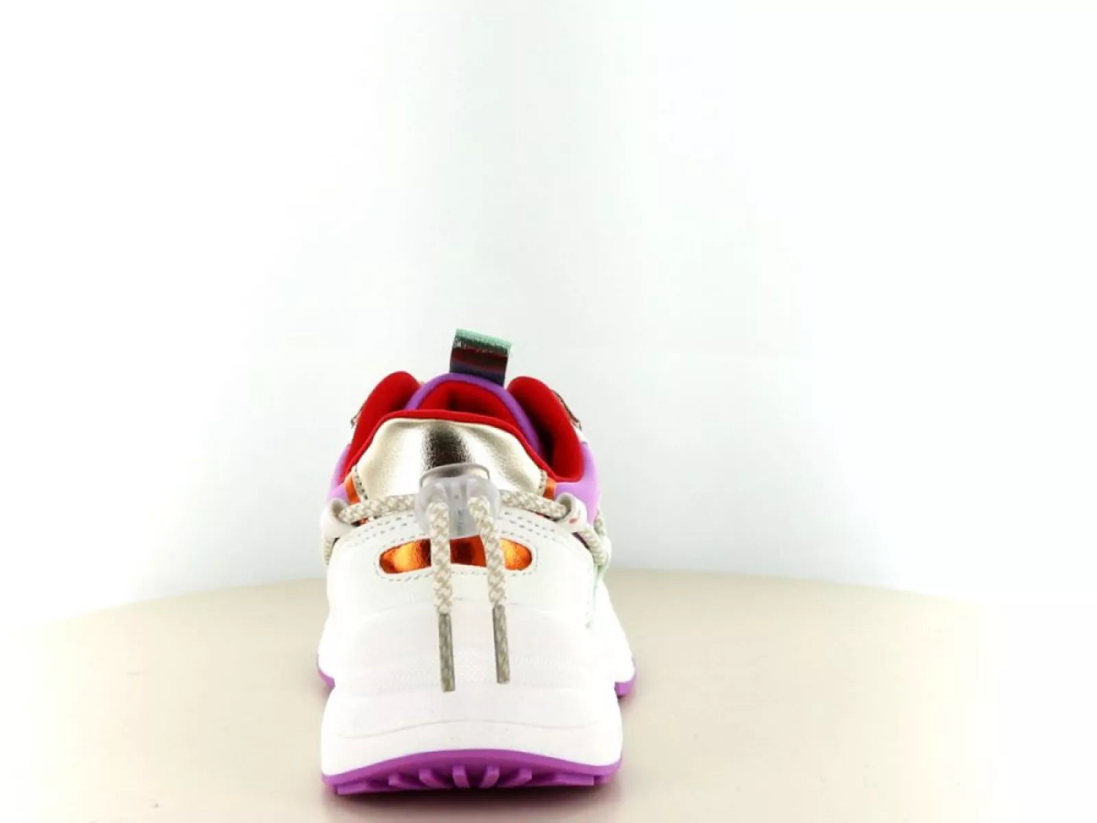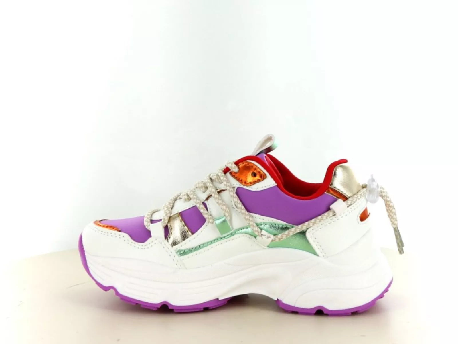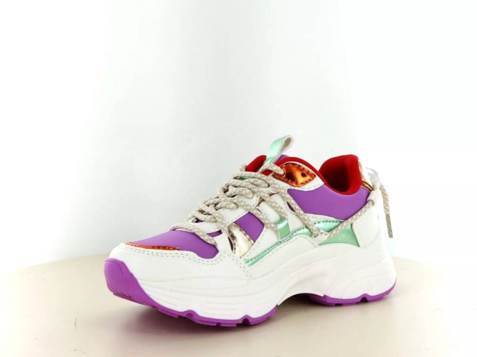 - Trendiges Design: Stylischer weißer Sneaker mit auffälligen lila und bunten Akzenten.