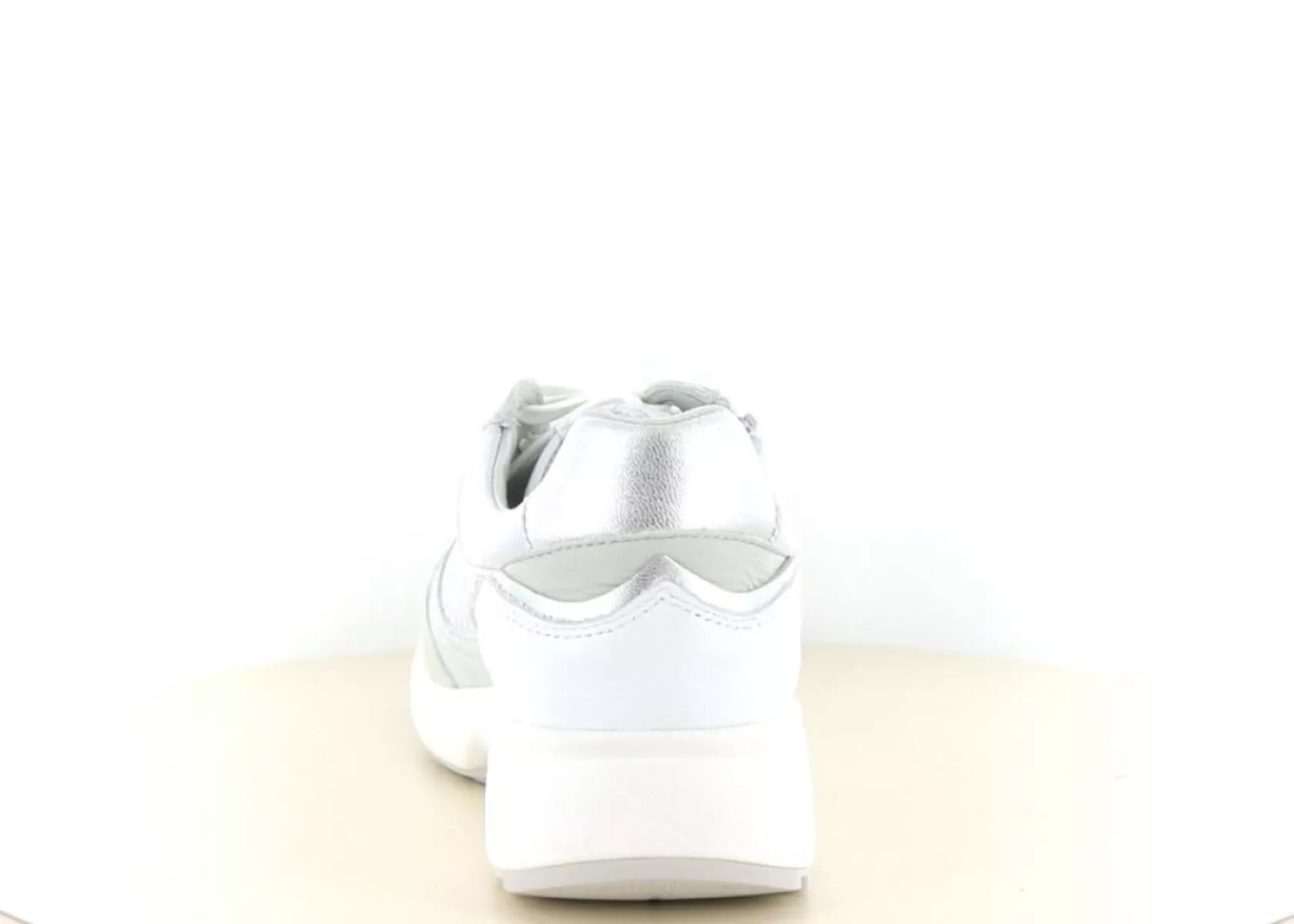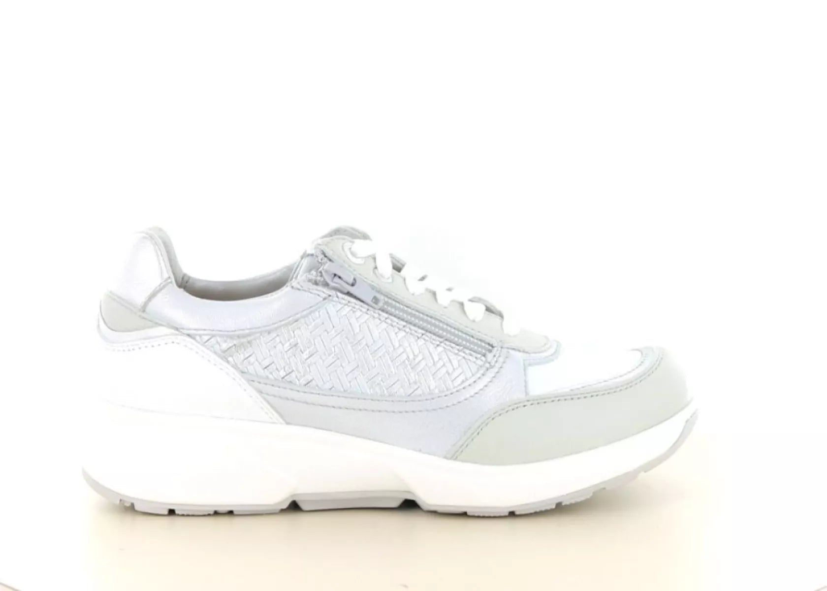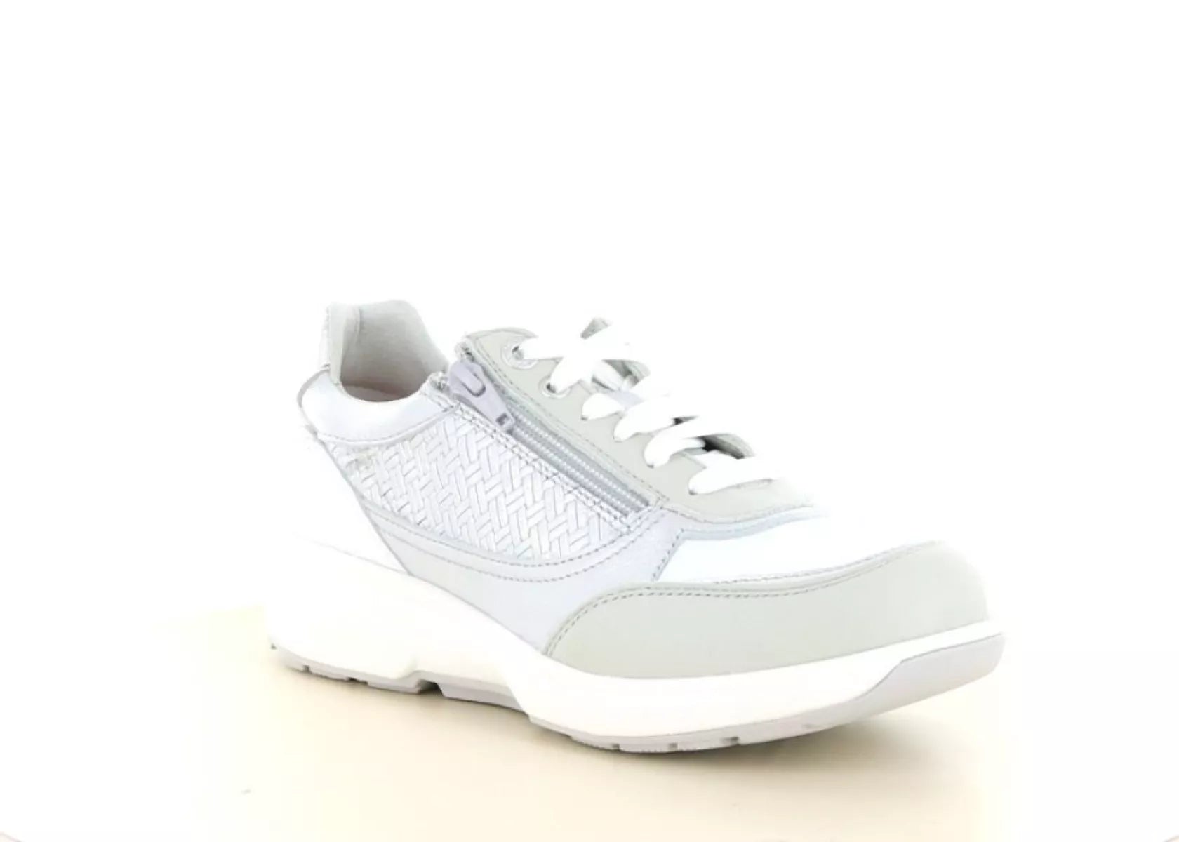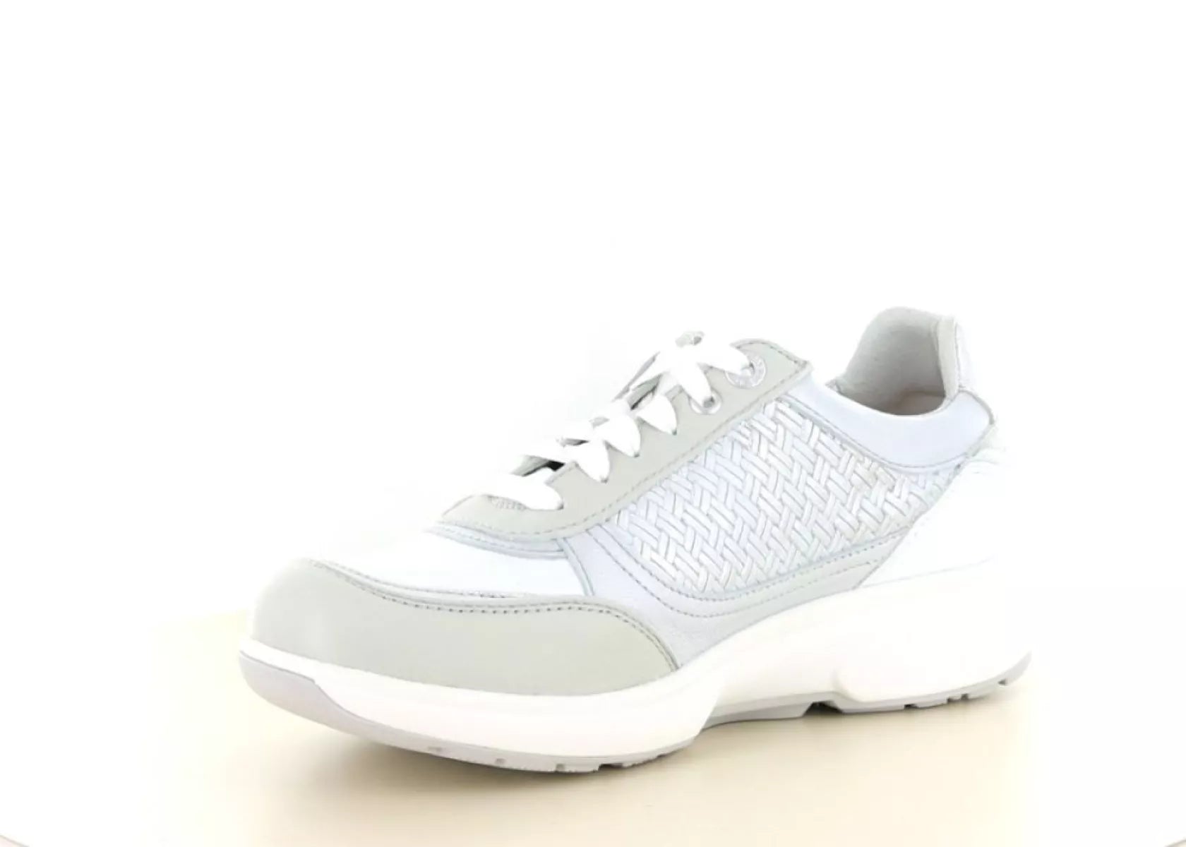 Das Obermaterial besteht aus geschmeidigem Leder in einer eleganten hellgrauen Farbkombination. Die dezente Kombination aus Glattleder und geflochtener Struktur verleiht dem Schuh einen luxuriösen Look. Die leichte Sohle sorgt für Stabilität und Komfort, während die sportliche Silhouette sowohl zu lässigen als auch zu sportlich-eleganten Outfits perfekt passt.